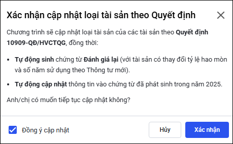 Tích chọn Đồng ý cập nhật và chọn Xác nhận để đồng ý cập nhật tài sản theo thông tư mới.