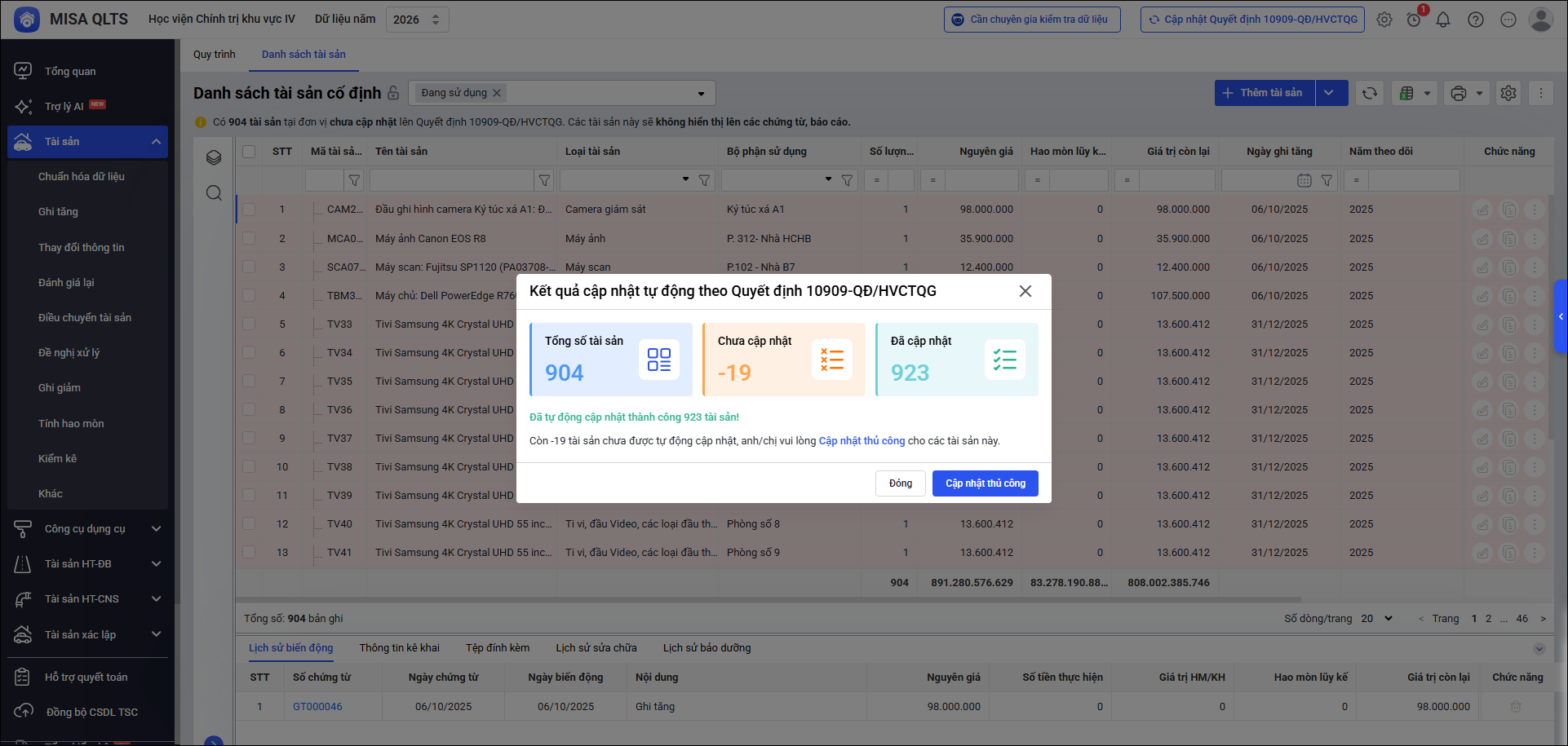 Tại màn hình Danh sách tài sản cố định, nhấn vào biểu tượng dấu ba chấm, chọn Cập nhật loại tài sản theo thông tư, sau đó chọn Cập nhật để cập nhật Quyết định số 10909/QĐ-HVCTQG
