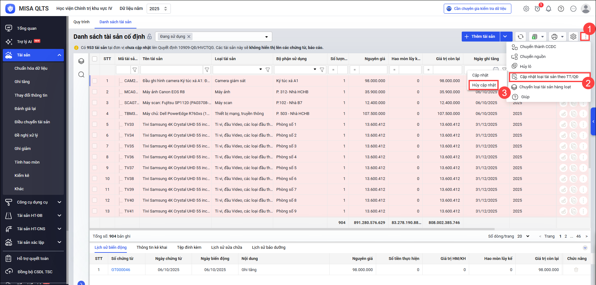 Trong trường hợp thực hiện cập nhật tài sản theo Quyết định số 10909/QĐ-HVCTQGcó sai sót, tính năng Hủy bỏ chuyển loại tài sản sẽ giúp lấy lại thông tin của tài sản tại thời điểm trước khi cập nhật.