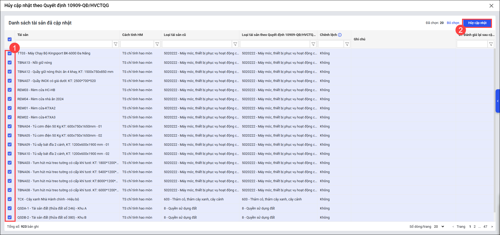 - Phần mềm sẽ hiển thị lên danh sách hủy chuyển đổi, tích chọn tài sản và nhấn Hủy cập nhật.