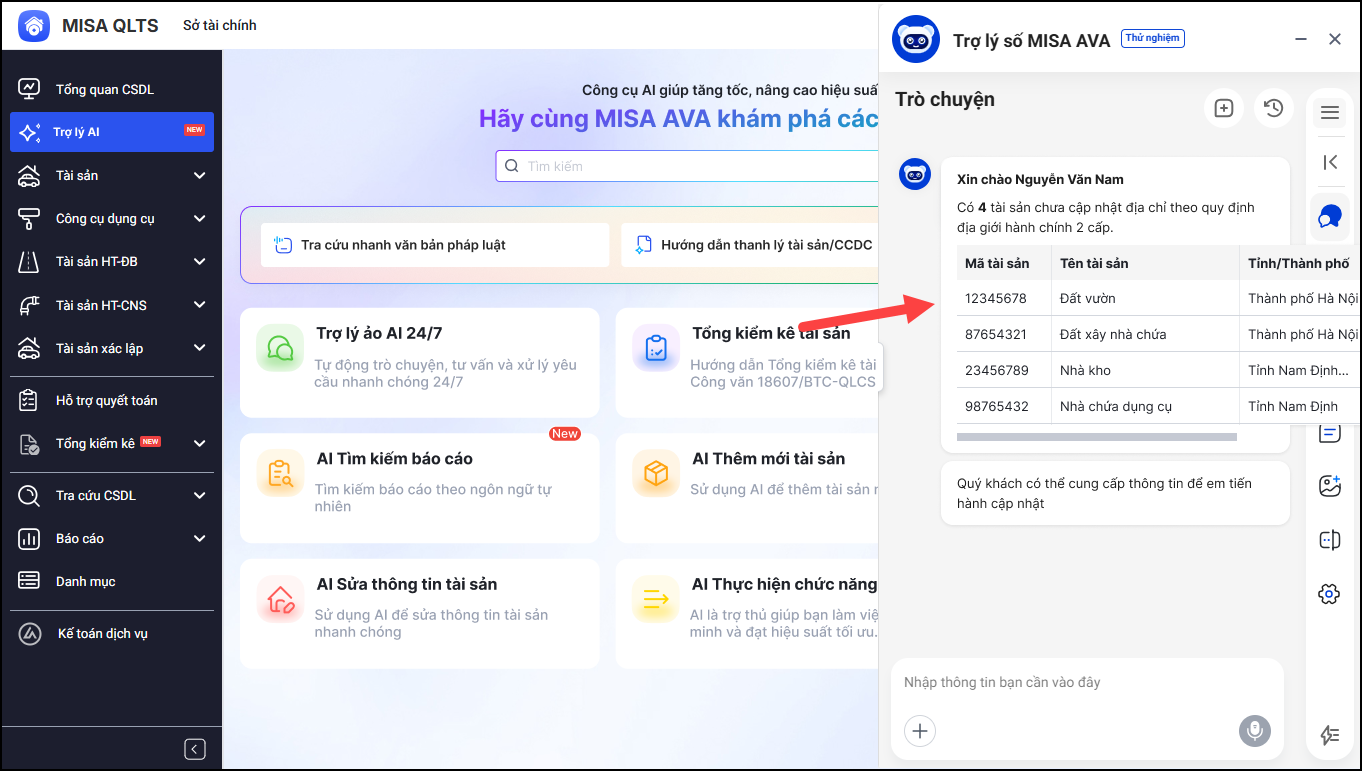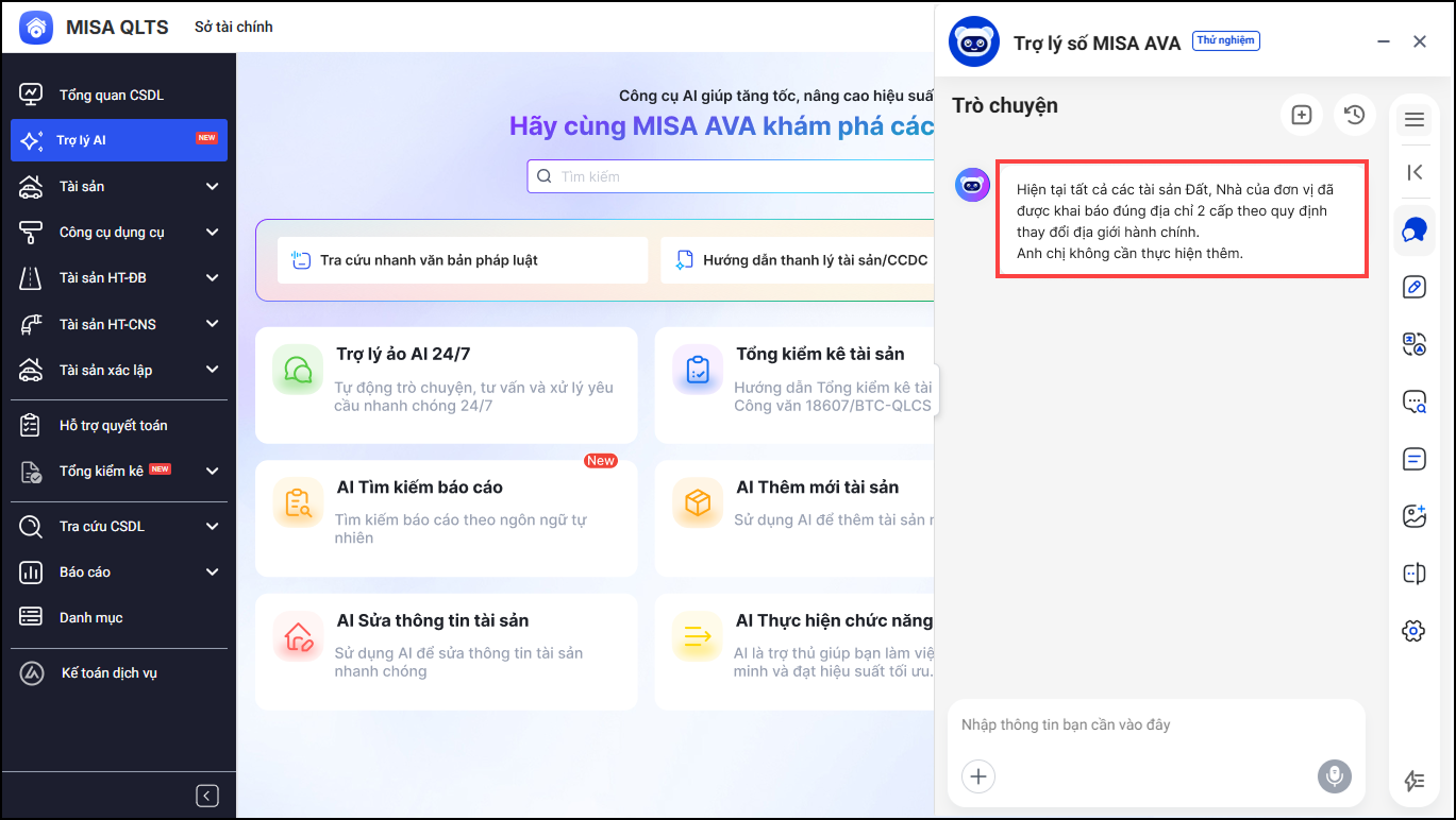 • MISA AVA phản hồi lại kết quả trong khung chat, anh/chị không cần cập nhật lại địa chỉ tài sản