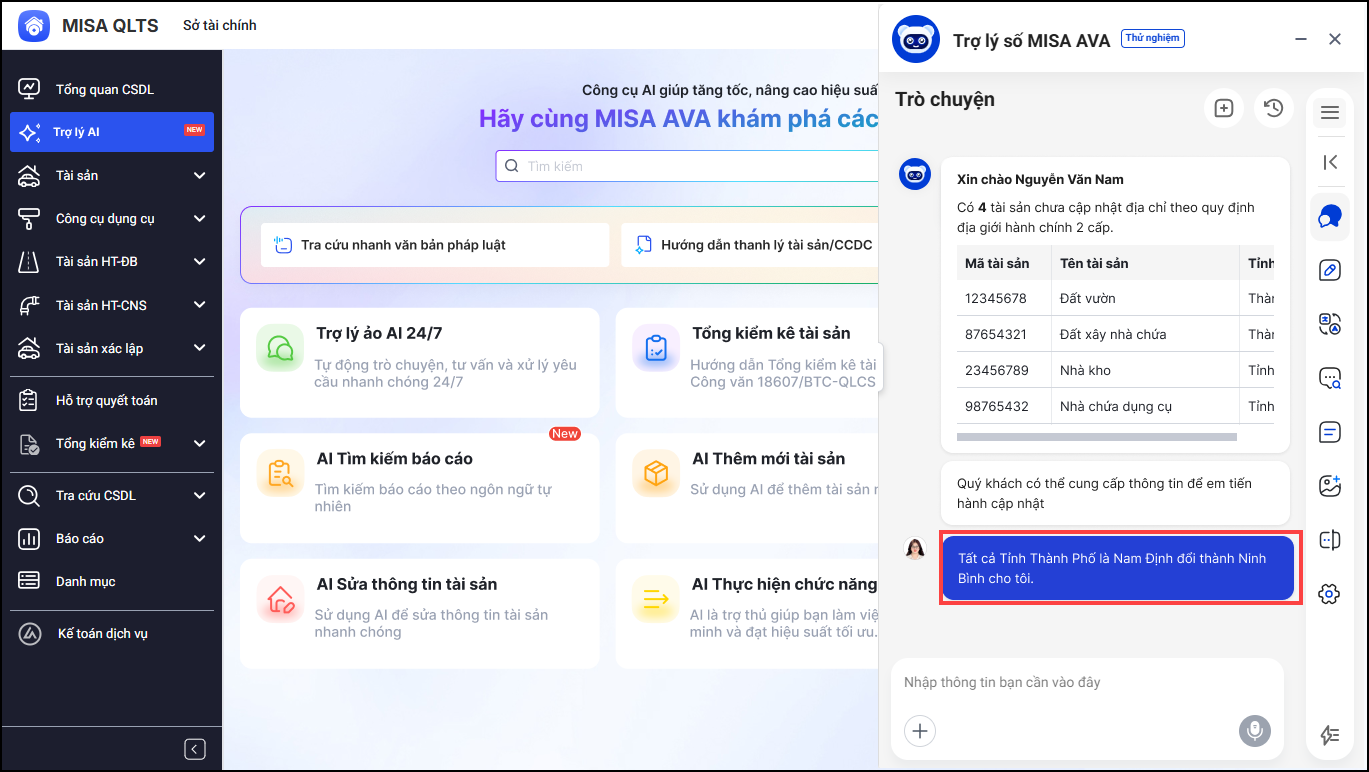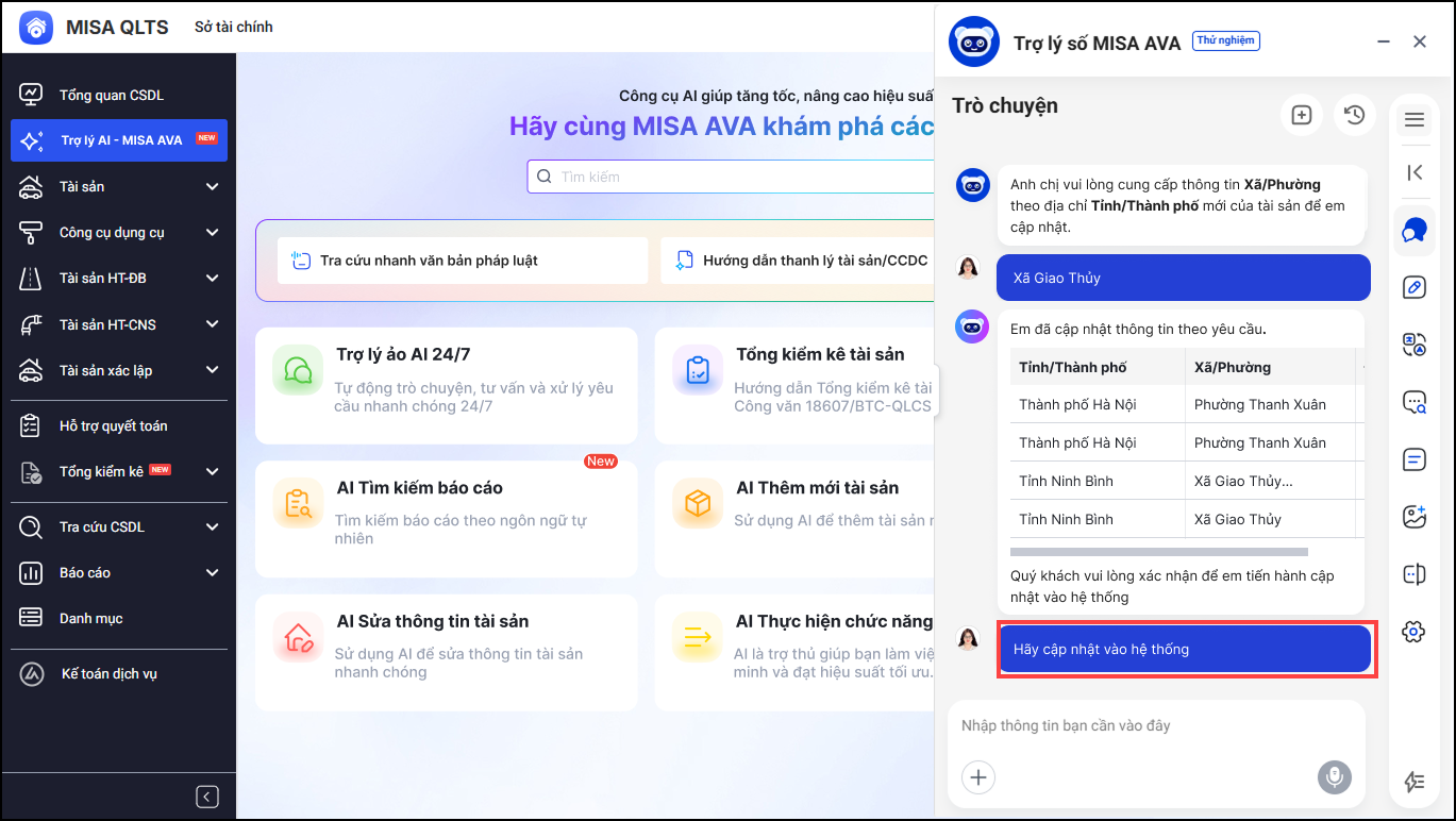 • Sau đó, anh/chị nhập câu lệnh Hãy cập nhật vào hệ thống để MISA AVA hỗ trợ cập nhật lại địa chỉ tài sản