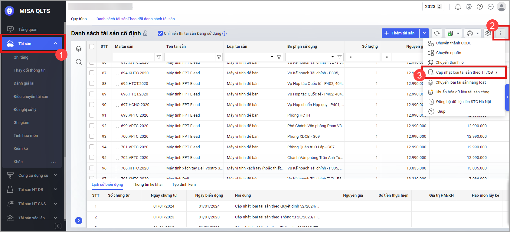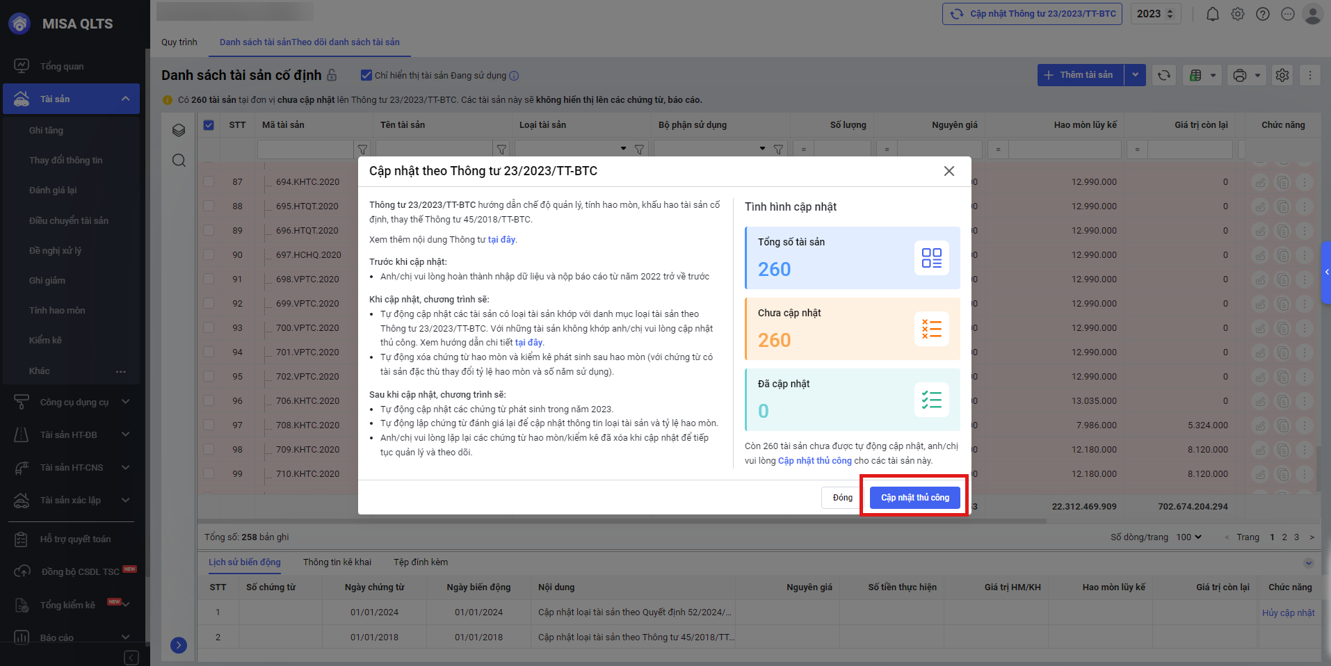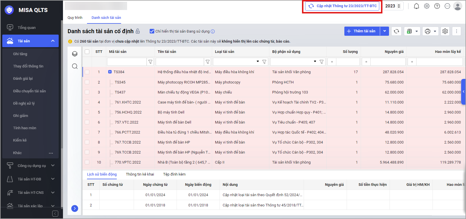 • Khi cán bộ QLTS tiến hành cập nhật thông tư 23/2023