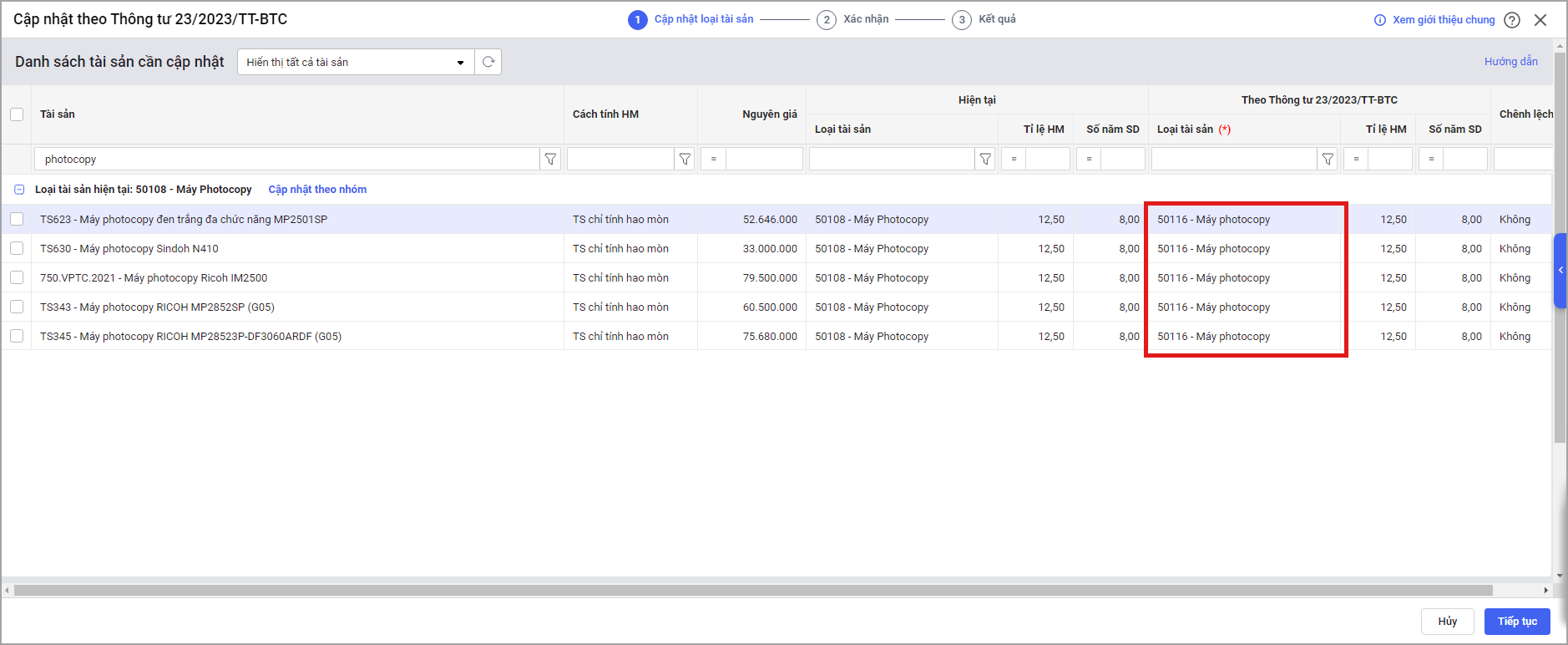 • Chọn loại tài sản mới cho các tài sản như Máy photocopyCamera giám sát theo danh mục TT45 phần mềm đã bổ sung.