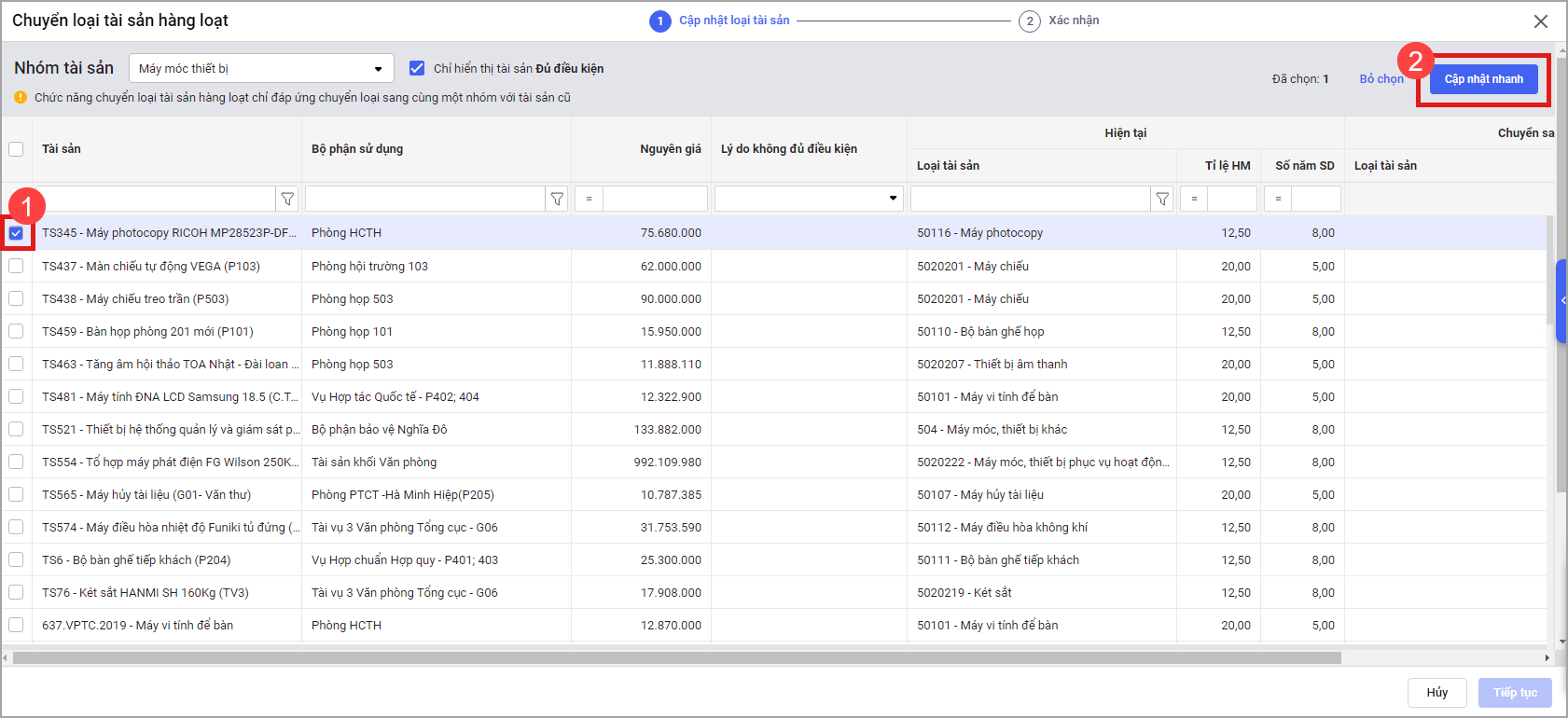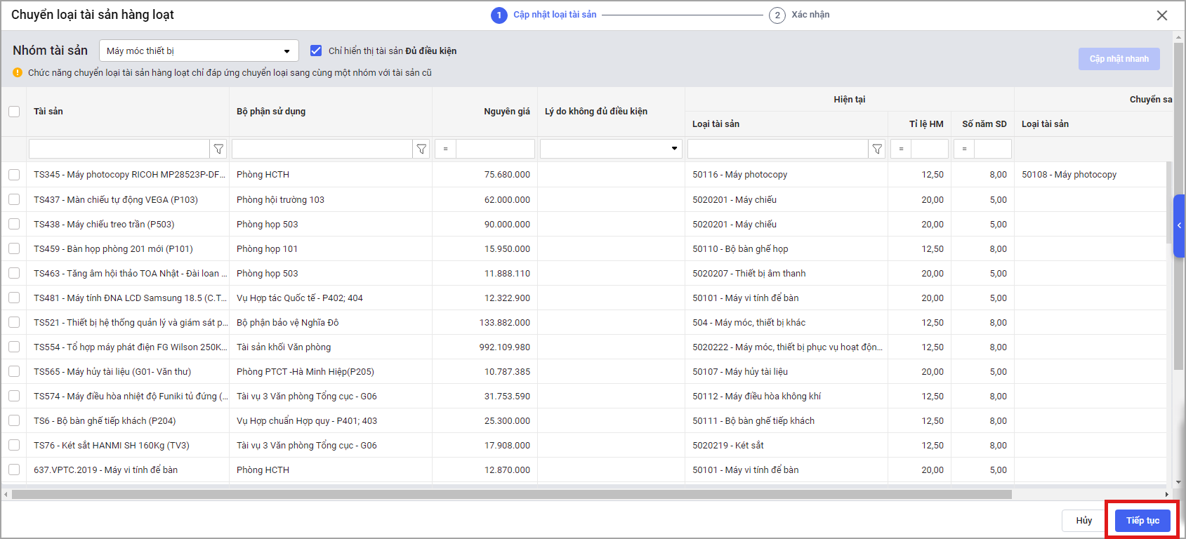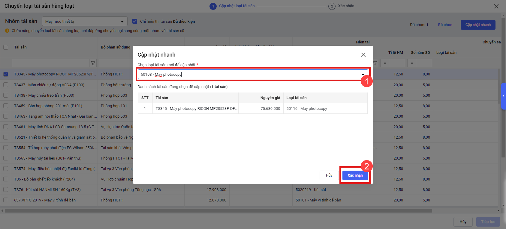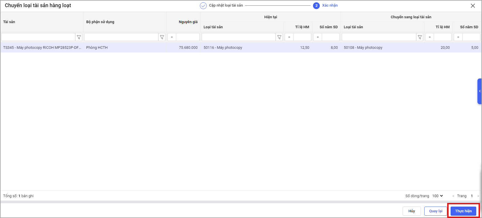 • Chọn Thực hiện để xác nhận chuyển loại tài sản
