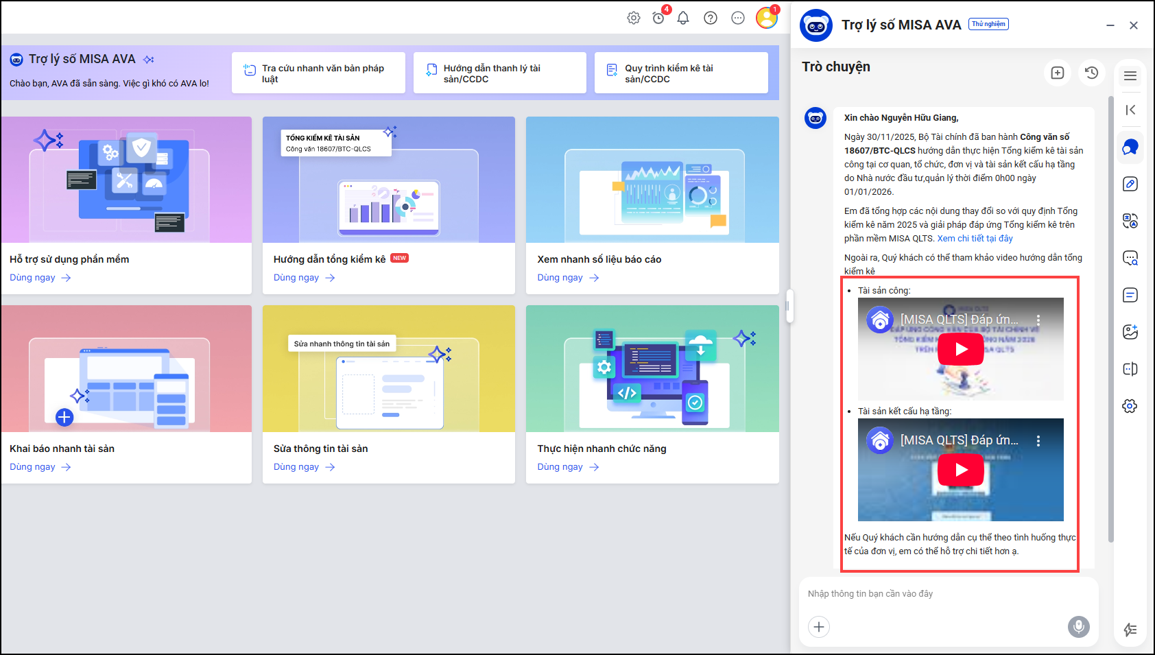 4. Hướng dẫn cán bộ QLTS xem video hướng dẫn công tác Tổng kiểm kê ngay trên phần mềm