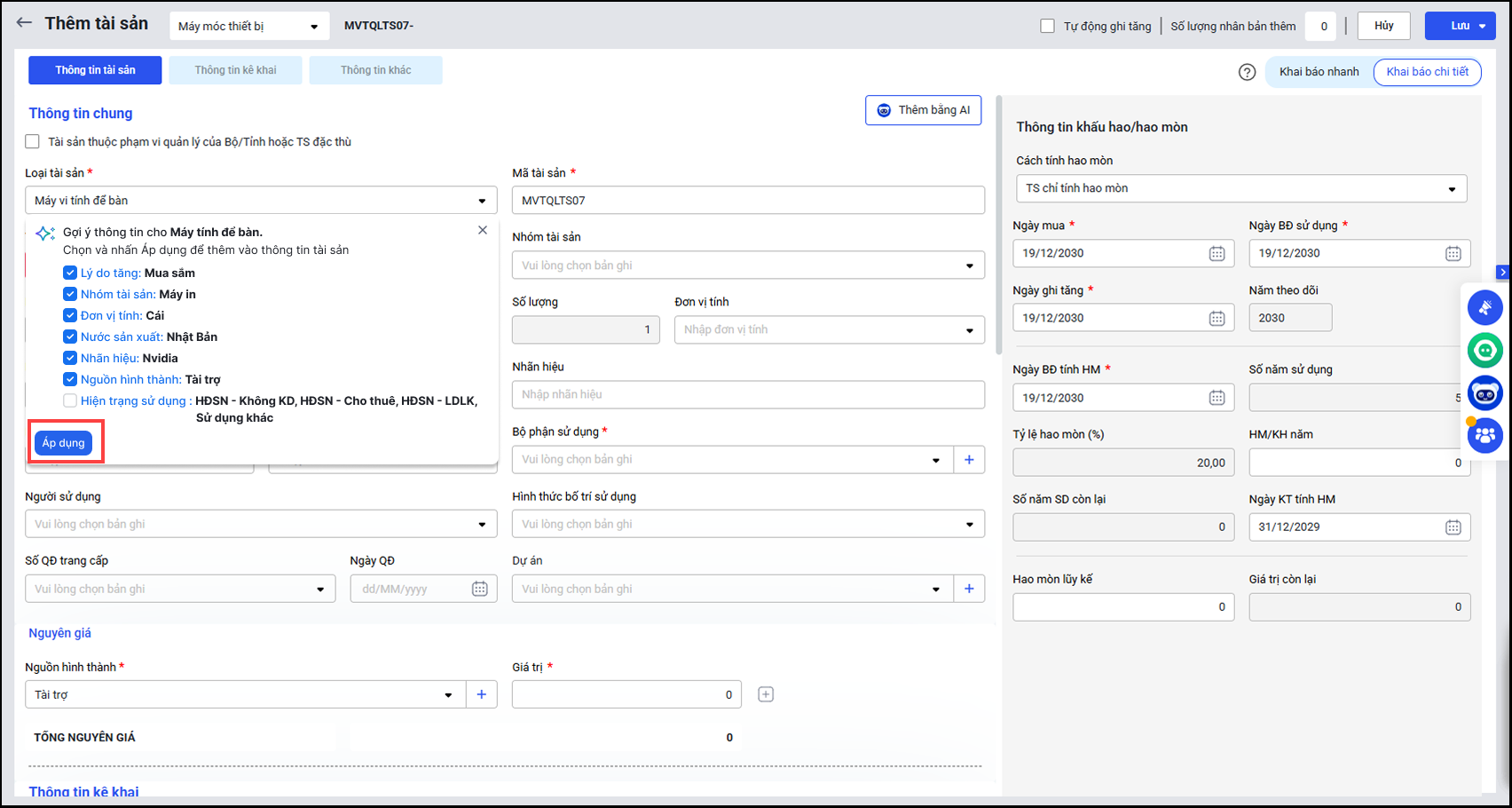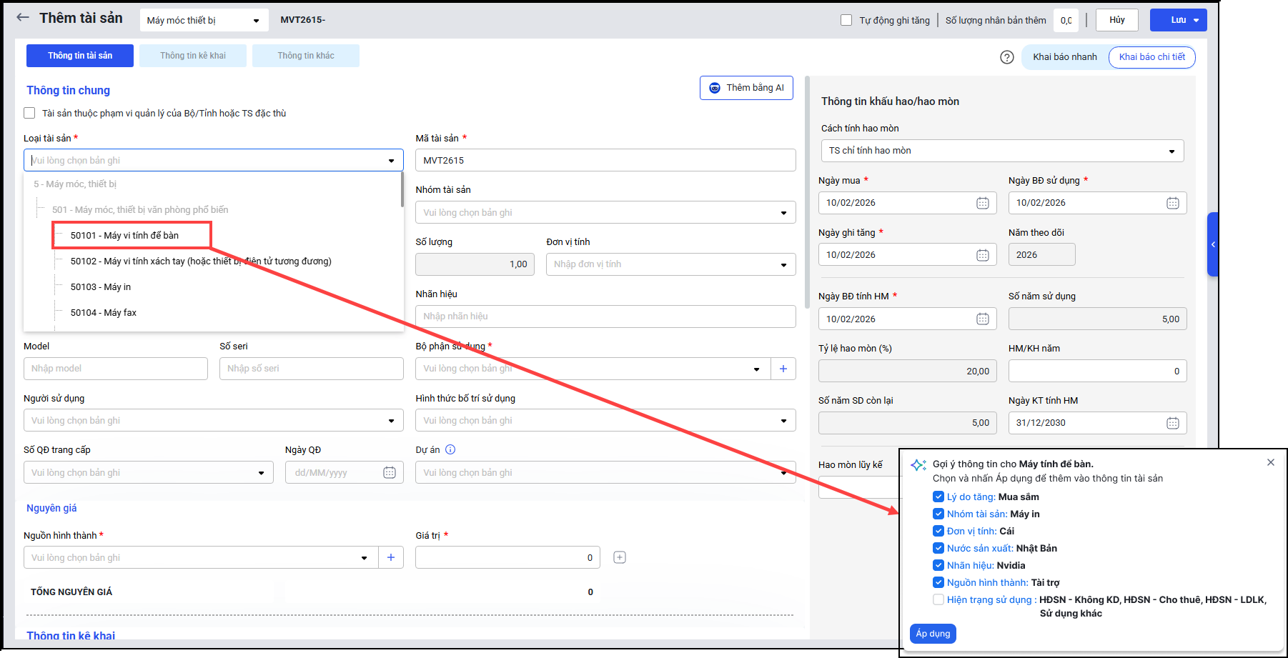 2. Tại Loại tài sản, sau chọn loại tài sản, trợ lý số MISA AVA sẽ gợi ý sẵn các thông tin cho tài sản anh/chị khai báo gồm: Lý do tăng, đơn vị tính, nước sản xuất, nhãn hiệu, nguồn hình thành, hiện trạng sử dụng…