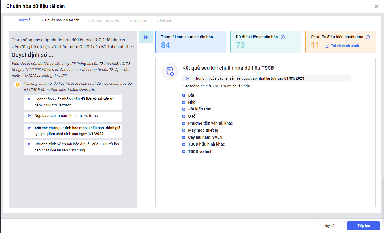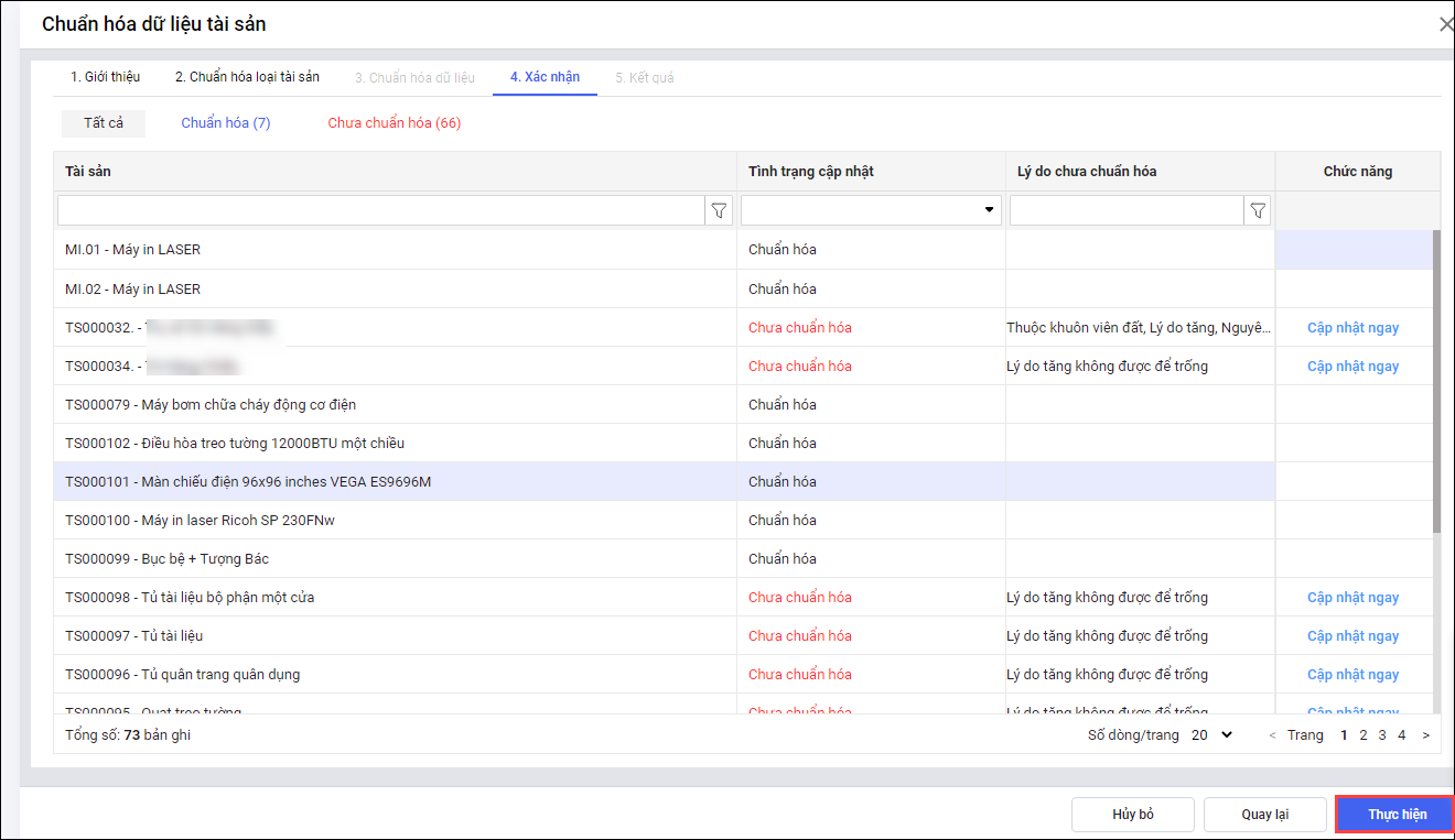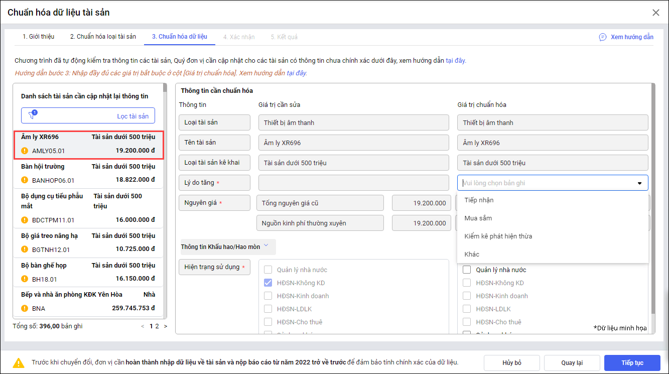 - Các bước thực hiện chuẩn hóa dữ liệu tài sản.