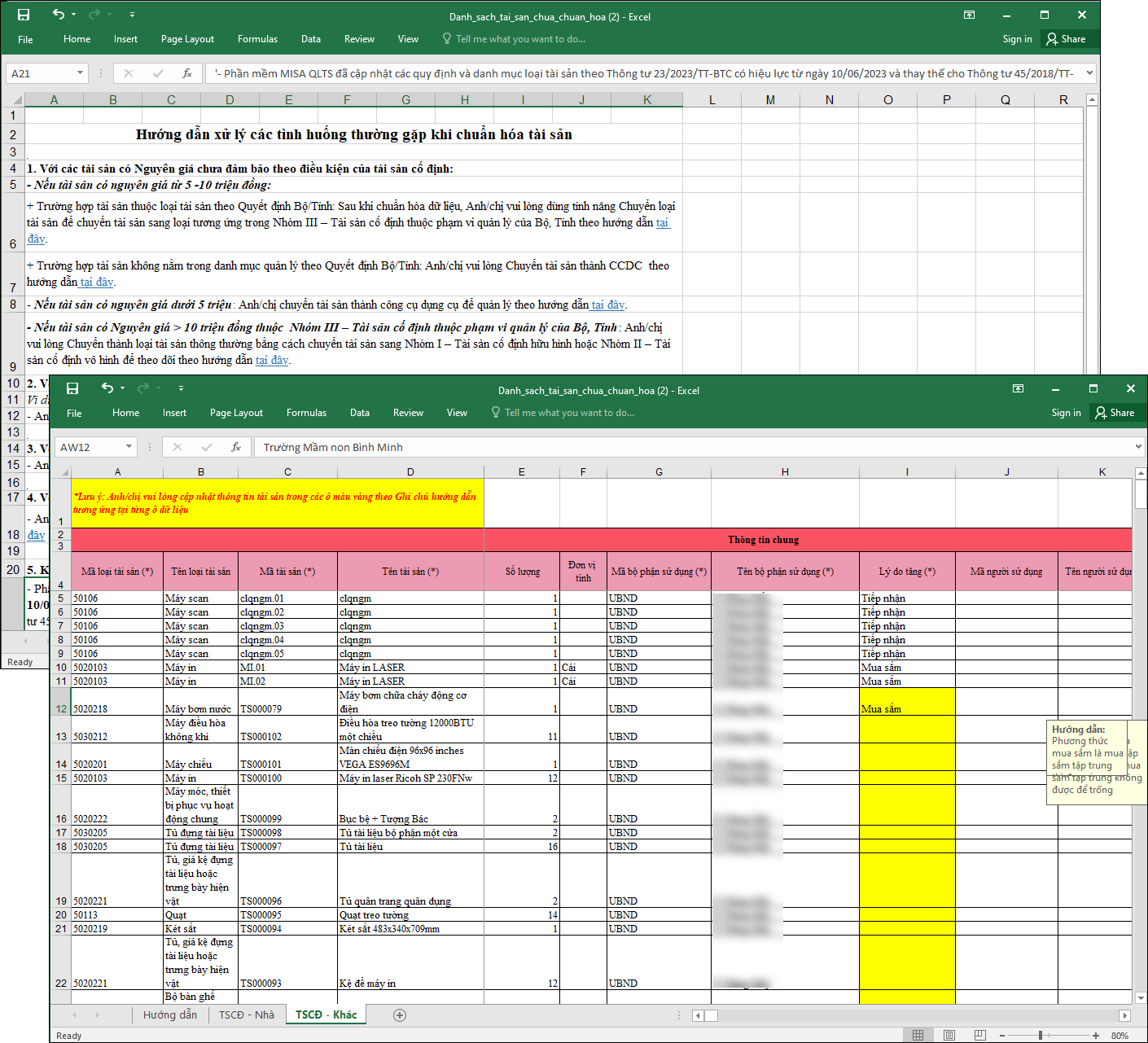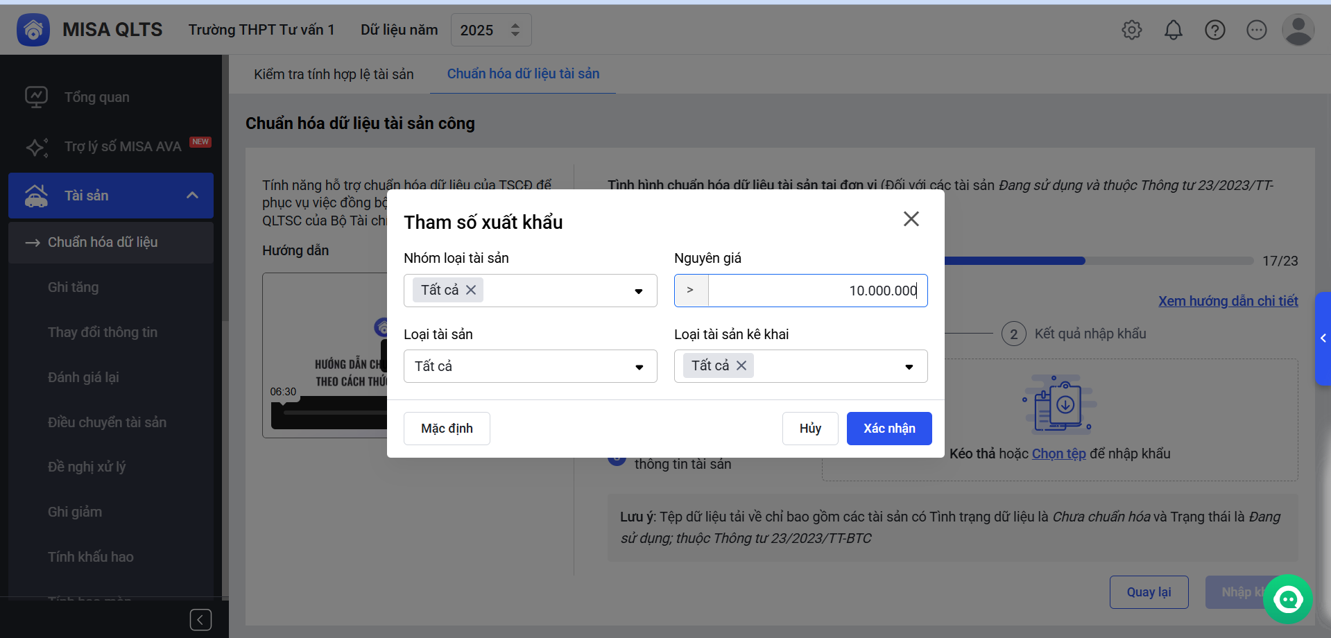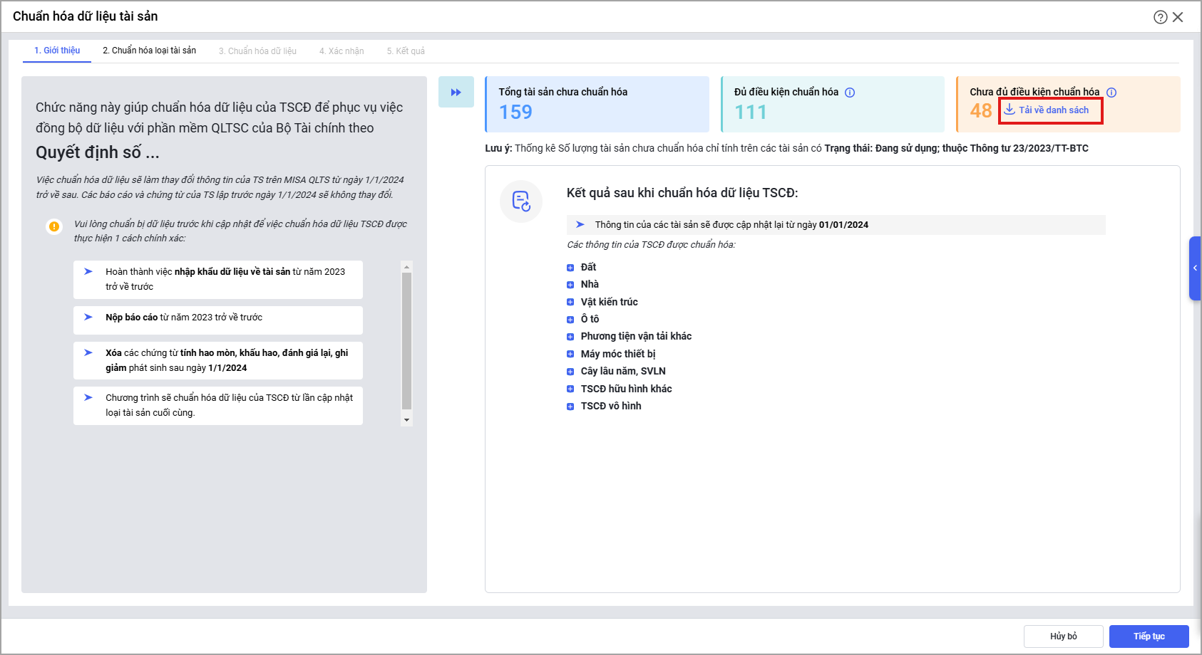 - Các bước thực hiện chuẩn hóa dữ liệu tài sản.
