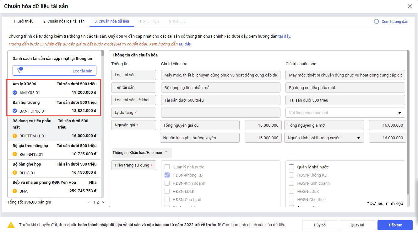 Ví dụ: Thực hiện chuẩn hóa vào năm 2025, thông tin tài sản được cập nhật lại từ ngày 01/01/2025. - Thông tin hao mòn, khấu hao của tài sản được tính theo loại tài sản mới (nếu có).