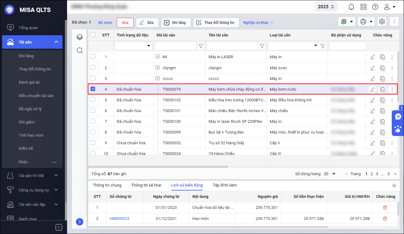 Bước 1: Vào menu Tài sản\Danh sách tài sản cố định, chọn tài sản cần hủy chuẩn hóa tài sản.