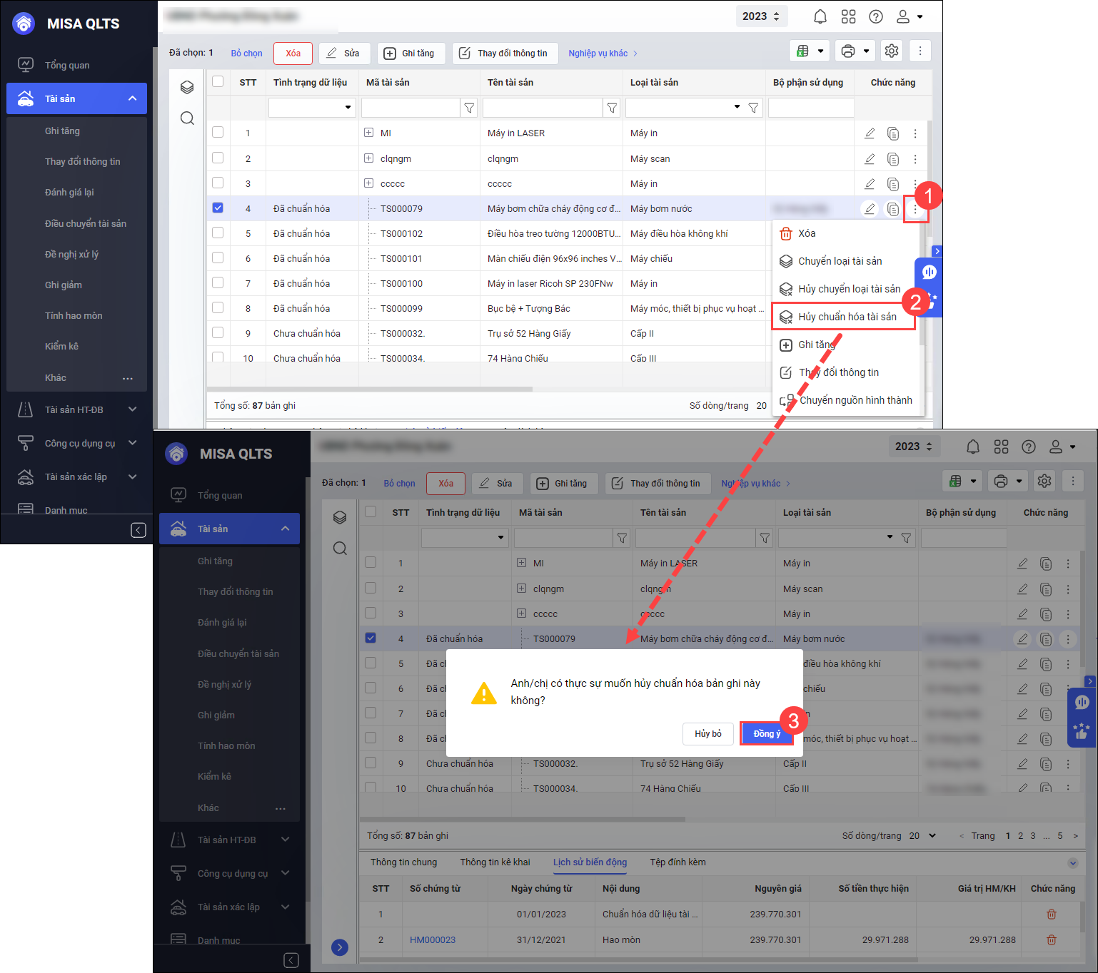 Bước 2: Nhấn vào biểu tượng dấu ba chấm ⁝ ở cuối dòng tên tài sản, chọn Hủy chuẩn hóa tài sản\ chọn Đồng ý.