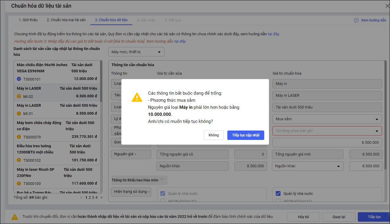 Bước 3: Tại giao diện chuẩn hóa loại tài sản, phần mềm lấy lên danh sách tài sản cần chuẩn hóa loại tài sản anh/chị nhấn Tiếp tục. Bước 4: Chọn tài sản cần chuẩn hóa tại danh sách tài sản cần cập nhật lại thông tin để thực hiện bổ sung, chỉnh sửa thông tin tài sản: Sau khi bổ sung đầy đủ thông tin, anh/chị nhấn chọn sang tài sản khác tại danh sách tài sản cần cập nhật thông tin để tiếp tục thao tác. Với những tài sản đã chuẩn hóa sẽ hiển thị dấu tích màu xanh. Lưu ý: Nếu tài sản chưa cập nhật đủ thông tin, khi nhấn chuyển sang tài sản khác để chuẩn hóa phần mềm sẽ cảnh báo (các thông tin bắt buộc đang để trống…). Sau khi cập nhật xong các thông tin, anh/chị nhấn Tiếp tục. Bước 5: Xác nhận Tại giao diện xác nhận, phần mềm hiển thị danh sách tài sản và tình trạng cập nhật đã chuẩn hóa và chưa chuẩn hóa dữ liệu. Bước 6: Kết quả Phần mềm hiển thị danh sách tài sản đã hoàn thành chuẩn hóa và chưa chuẩn hóa. Nhấn Kết thúc để đóng chức năng chuẩn hóa hoặc nhấn Chuẩn hóa tiếp để tiếp tục thực hiện chuẩn hóa các tài sản còn lại. Anh/chị có thể xuất file kết quả về máy để phục vụ công tác lưu trữ, báo cáo. |