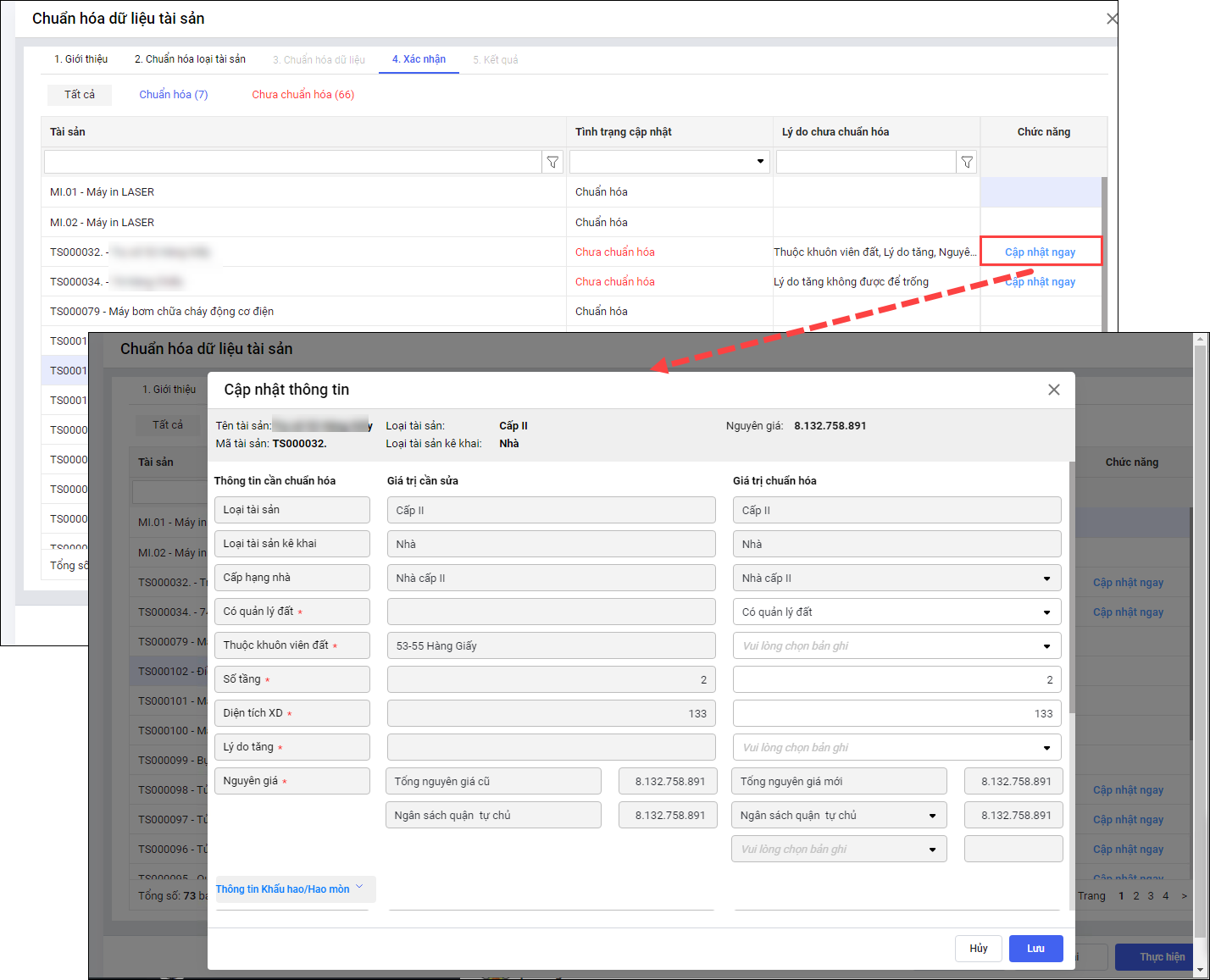 Lưu ý: Sau khi hủy chuẩn hóa tài sản tất cả thông tin sẽ quay về trạng thái ban đầu trước khi chuẩn hóa tài sản.