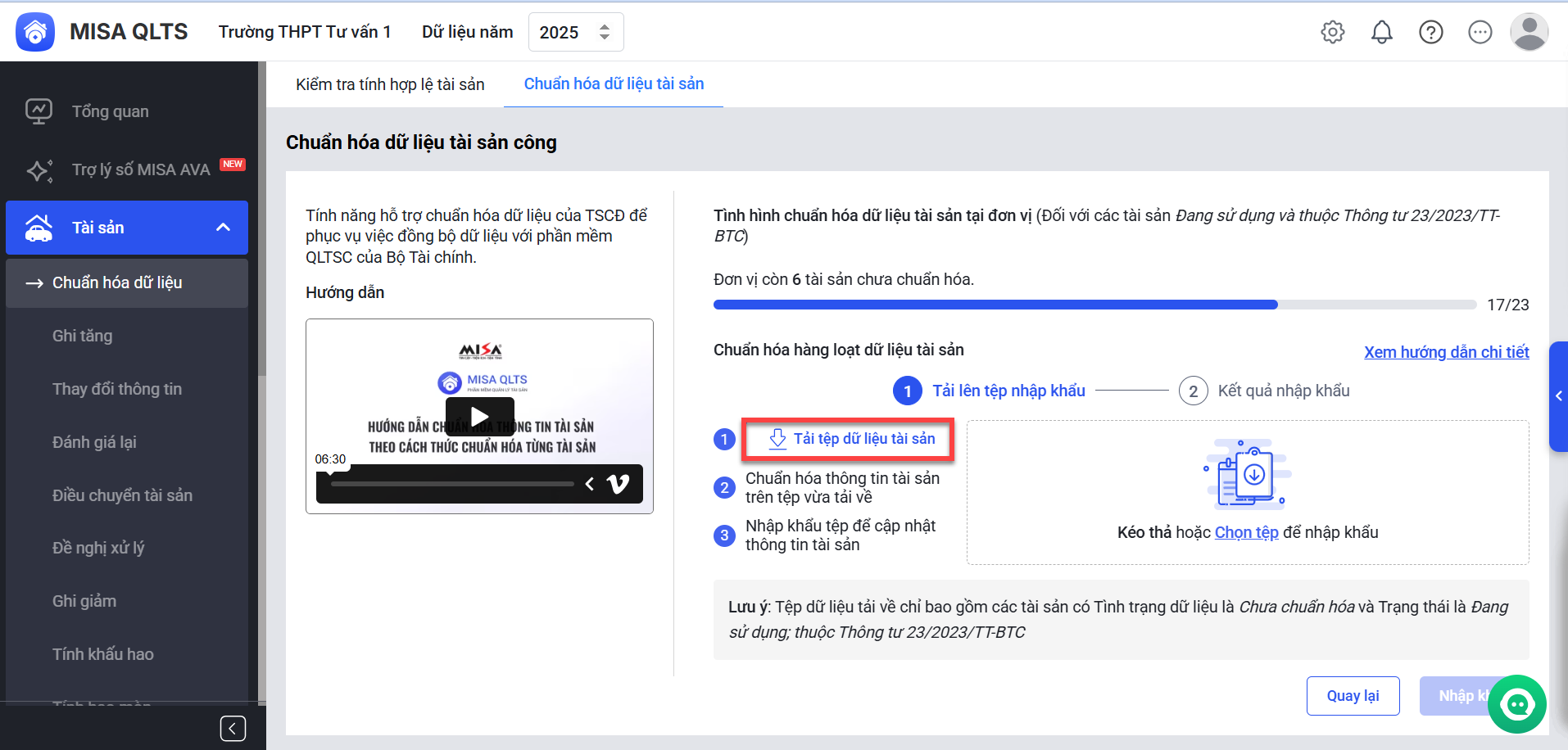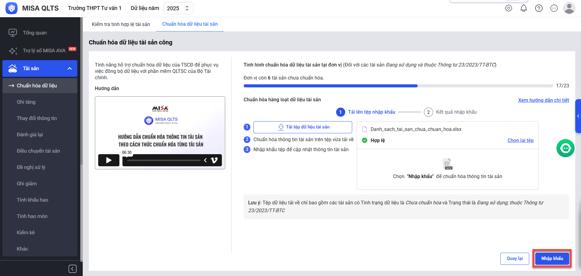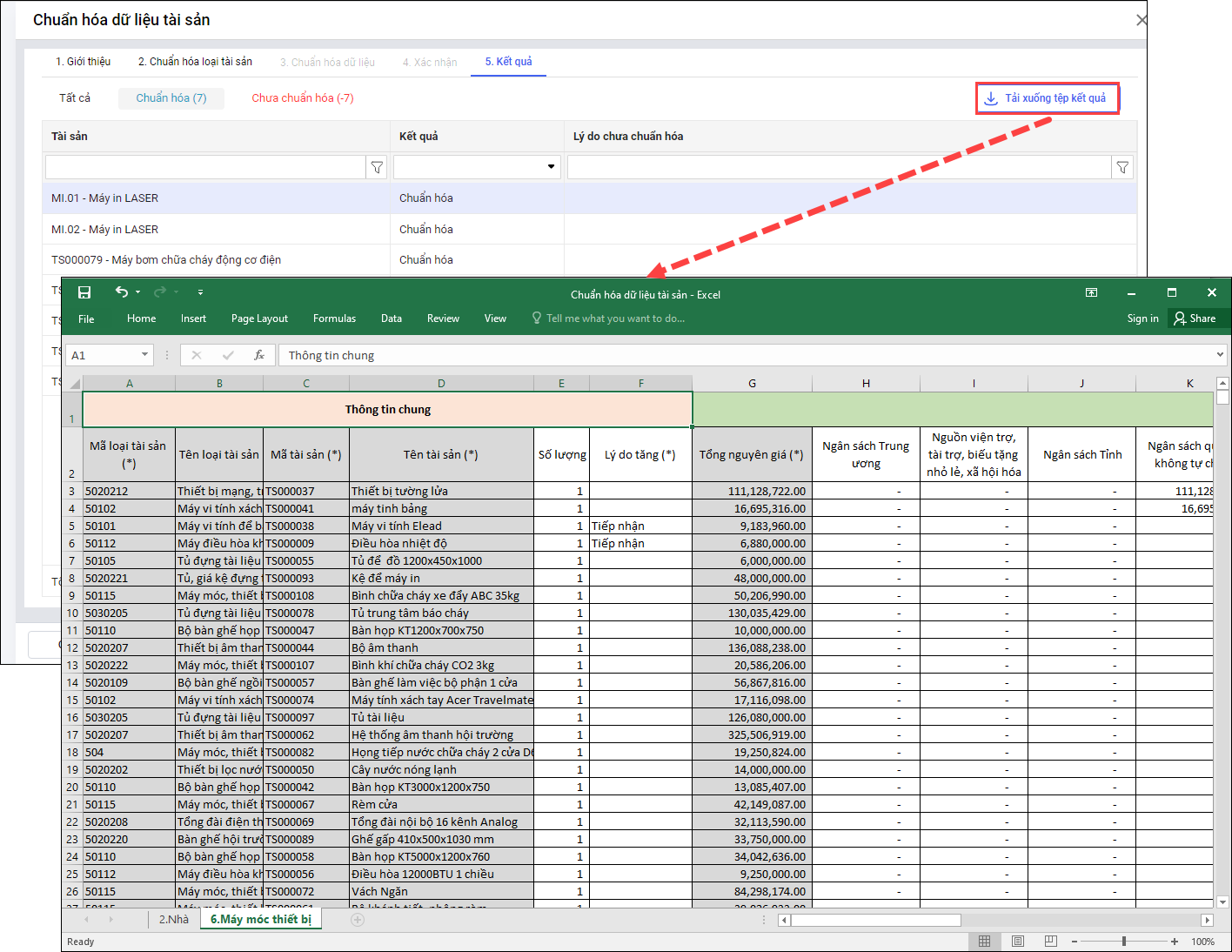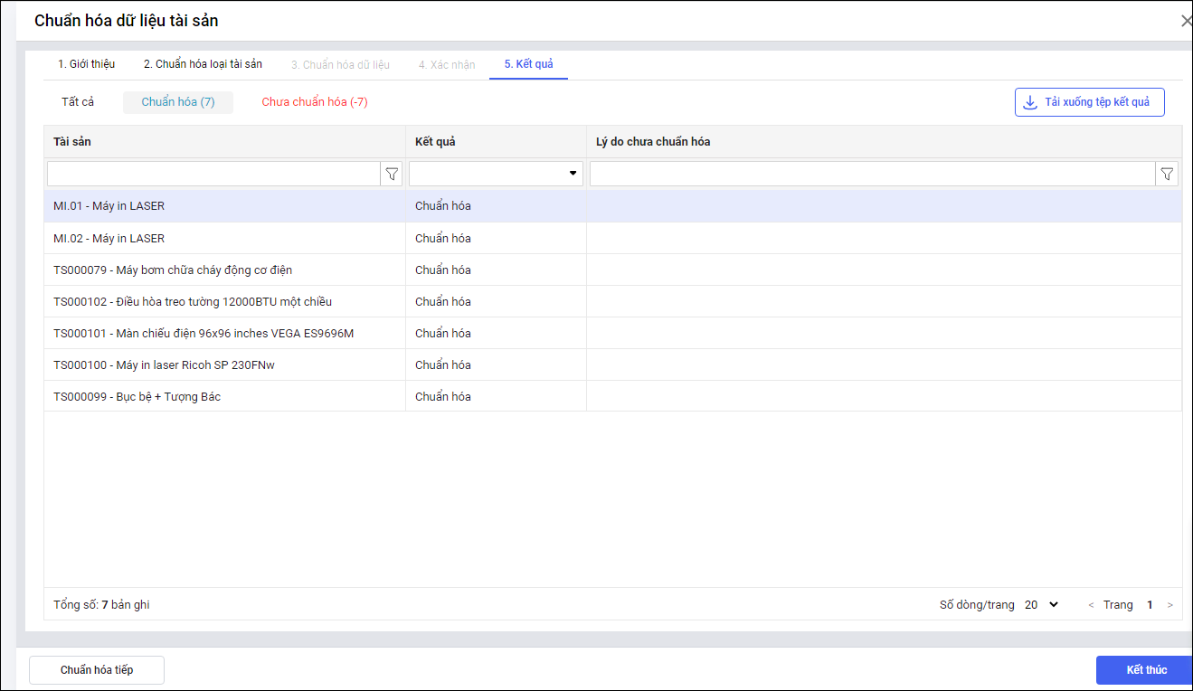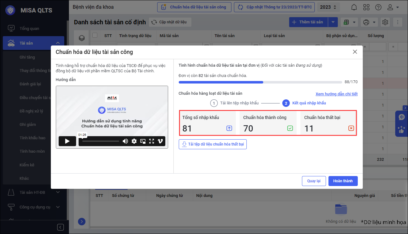 Lưu ý: Với tài sản chuẩn hóa dữ liệu thất bại, anh/chị chọn Tải tệp dữ liệu chuẩn hóa thất bại để kiểm tra, cập nhật rồi nhập khẩu lại vào phần mềm.