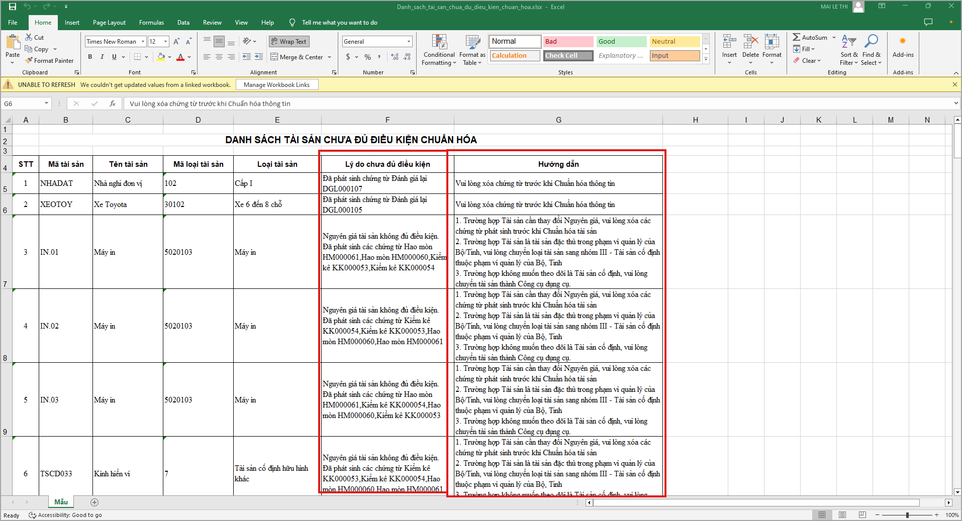 - Kiểm tra tình trạng dữ liệu tài sản chưa chuẩn hóa.