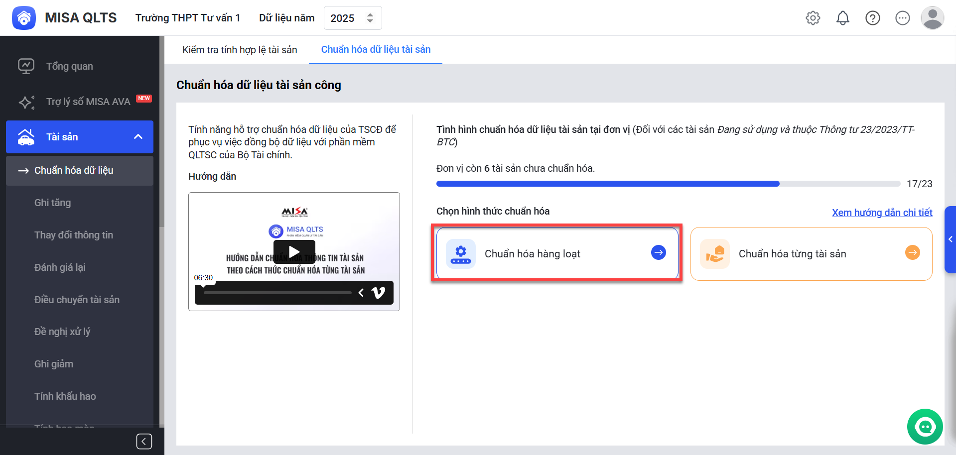 Tại giao diện Chuẩn hóa dữ liệu tài sản công anh/chị có thể theo dõi nhanh tình hình chuẩn hóa dữ liệu tài sản tại đơn vị (Tổng số tài sản; số lượng tài sản Chưa chuẩn hóa) cùng video hướng dẫn thao tác chi tiết.