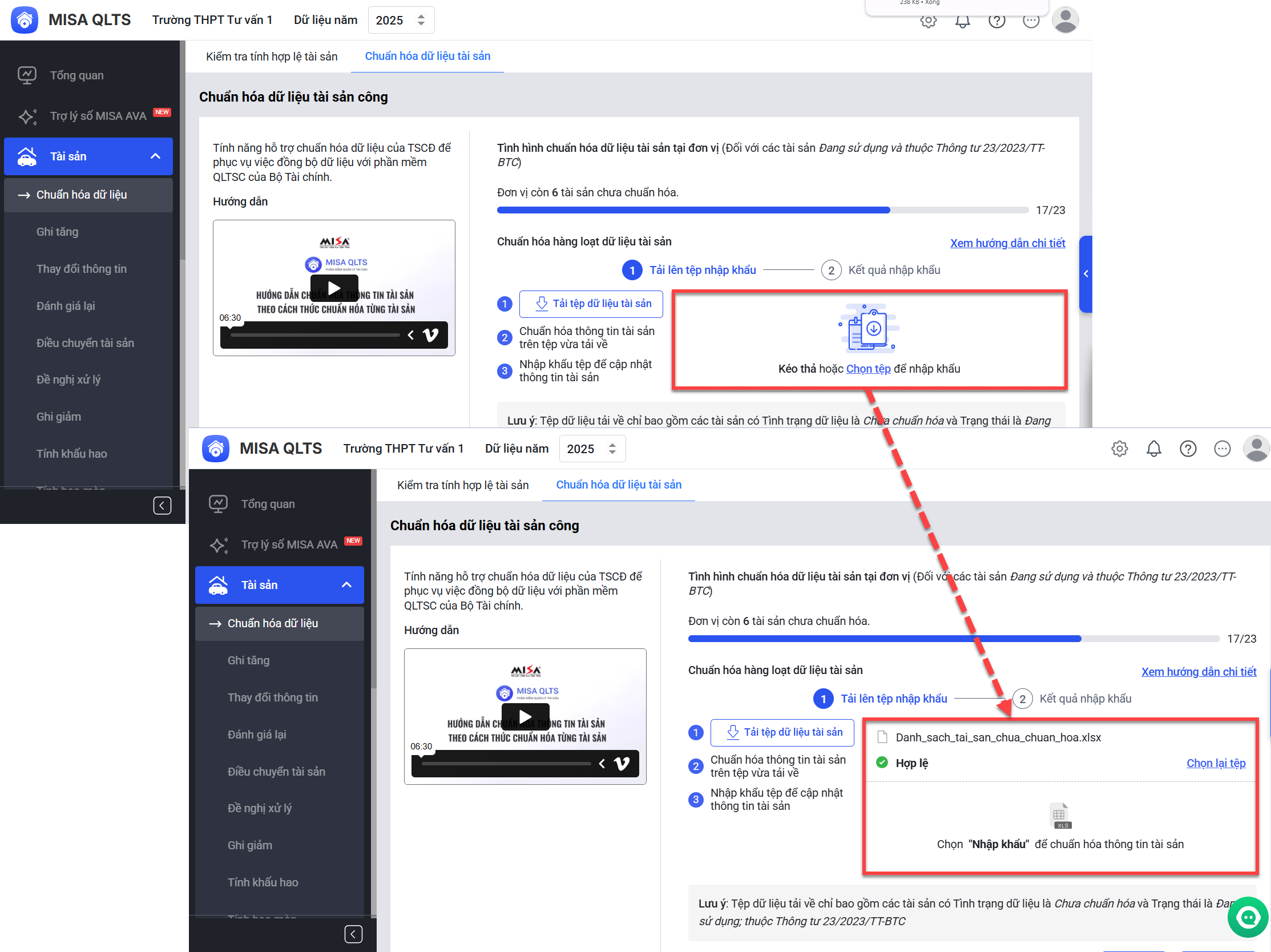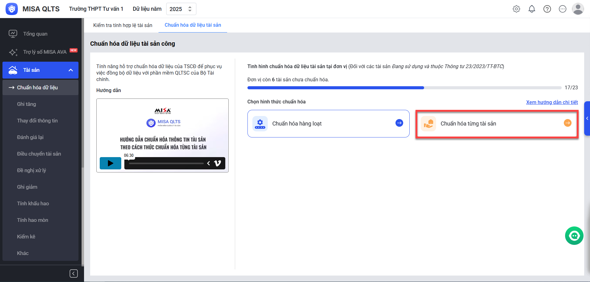 Xem video hướng dẫn tại đây: Bước 1: Tại menu Tài sản\ Chuẩn hóa dữ liệu, anh/chị chọn Chuẩn hóa dữ liệu tài sản. Bước 2: Chọn hình thức Chuẩn hóa hàng loạt. Bước 3: Nhấn Tải tệp dữ liệu tài sản / Nhấn xác nhận để tải về danh sách tài sản chưa được chuẩn hóa trên phần mềm. Bước 4: Anh/chị vui lòng cập nhật thông tin tài sản trong các ô màu vàng theo ghi chú hướng dẫn tương ứng tại từng ô dữ liệu. Bước 5: Sau khi hoàn tất và bổ sung đầy đủ các thông tin, anh/chị tải file lên phần mềm. Nhấn Chuẩn hóa dữ liệu tài sản công\Chọn tệp. Bước 6: Nhấn nhập khẩu Xem video hướng dẫn tại đây: Bước 1:Tại menu Tài sản\ Chuẩn hóa dữ liệu, anh/chị chọn Chuẩn hóa dữ liệu tài sản. Bước 2: Chọn hình thức Chuẩn hóa từng tài sản \ Nhấn Tiếp tục.