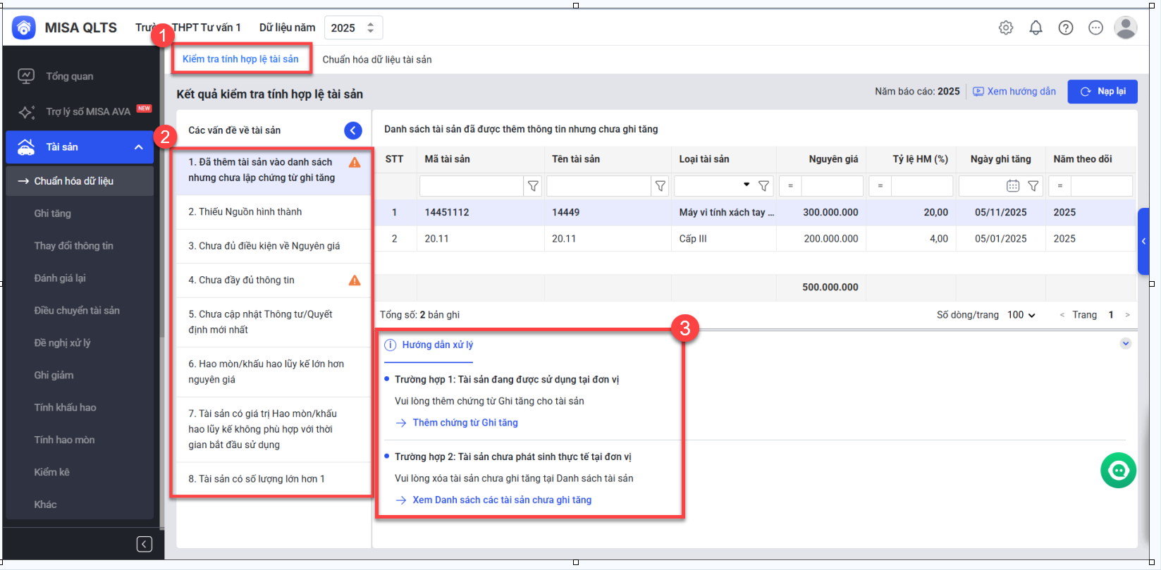 - Anh/chị có thể nhấp vào từng mục để xem danh sách tài sản tương ứng với từng lỗi. Ở mỗi mục, phần mềm đều hiển thị hướng xử lý chi tiết, anh/chị chỉ thực hiện theo đúng gợi ý mà phần mềm cung cấp để khắc phục lỗi.