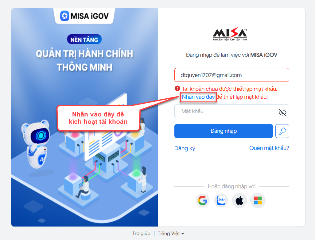 Trường hợp này do đơn vị chưa có tài khoản MISA ID (tức là tài khoản của đơn vị chưa được kích hoạt MISA ID, chưa sử dụng để đăng nhập vào bất kỳ ứng dụng nào của MISA như MISA Mimosa online, QLCB, Salagov…). Anh/chị thực hiện các bước sau để kích hoạt tài khoản:
