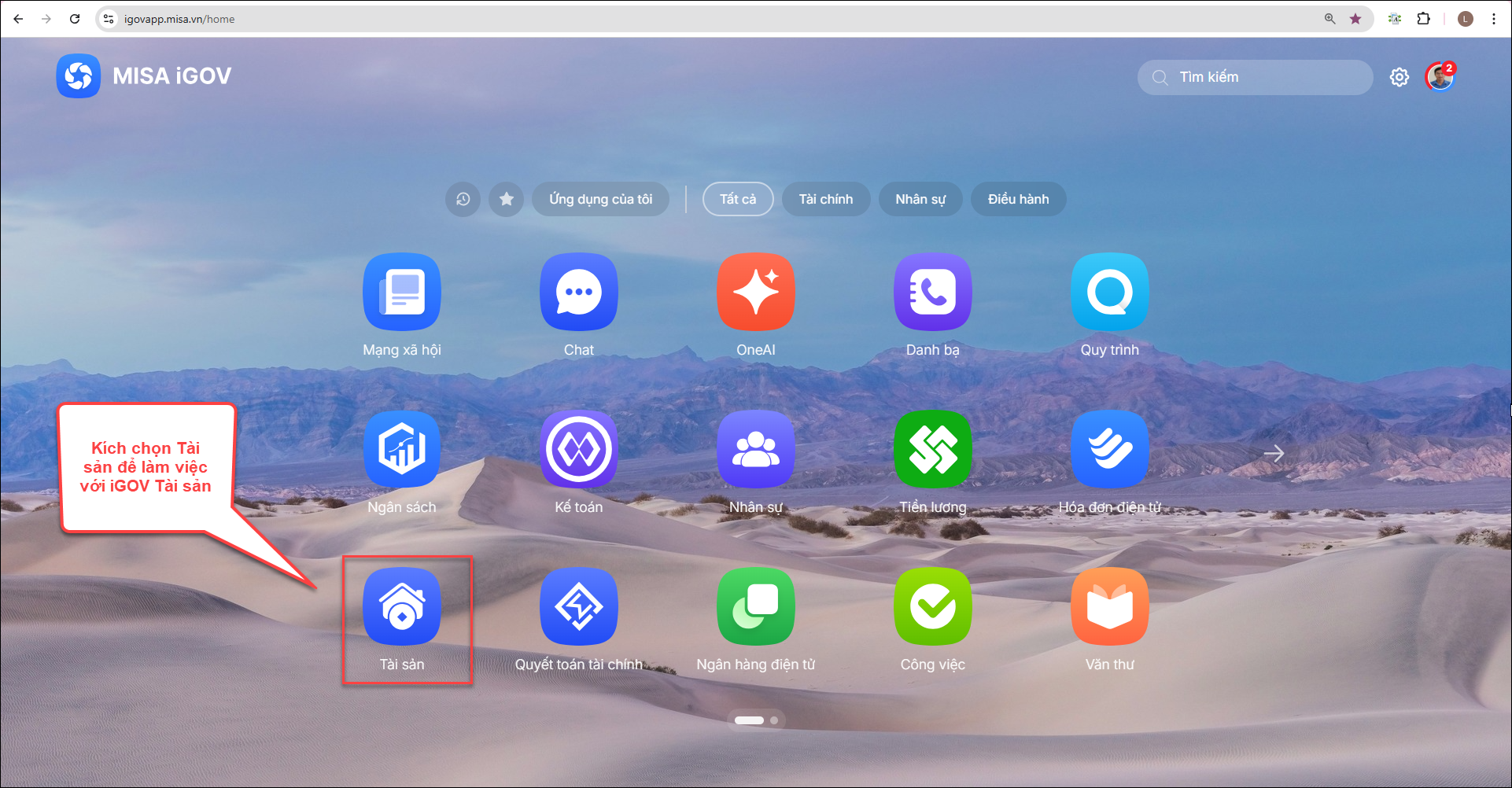 2. Anh/chị kích chuột vào ứng dụng Tài sản để làm việc với ứng dụng iGOV Tài sản.