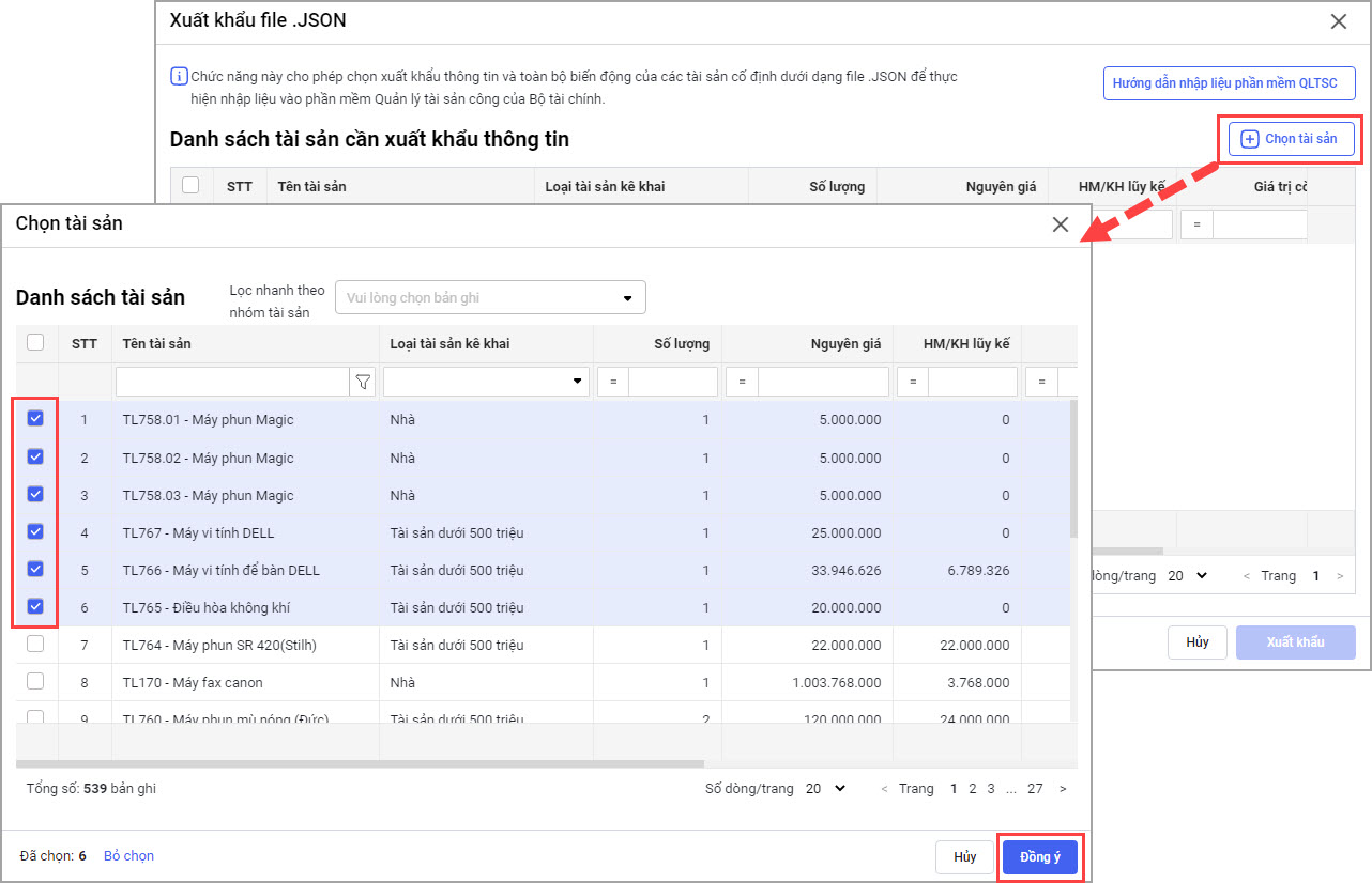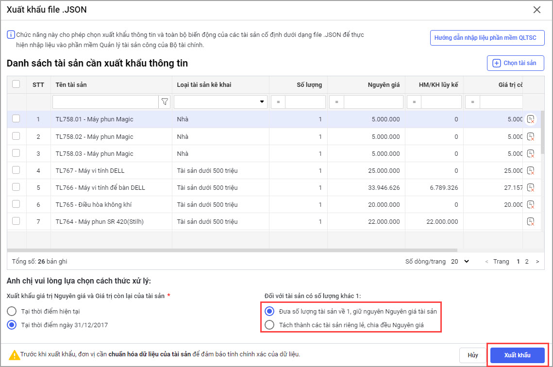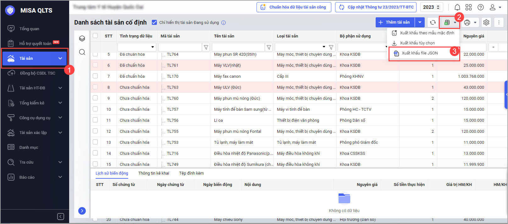 - Thực hiện xuất khẩu file JSON và chuyển sang phần mềm QLTSC như sau: