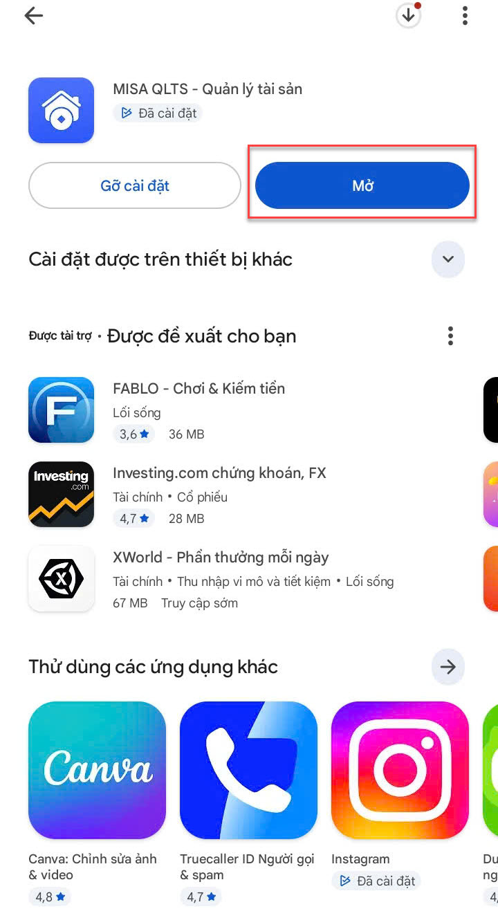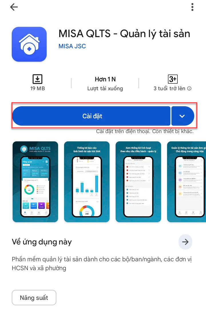Bước 1: Vào chợ ứng dụng CH Play, nhập MISA QLTS trên thanh tìm kiếm. Chọn ứng dụng MISA QLTS – Quản lý tài sản \ Chọn Cài đặt.