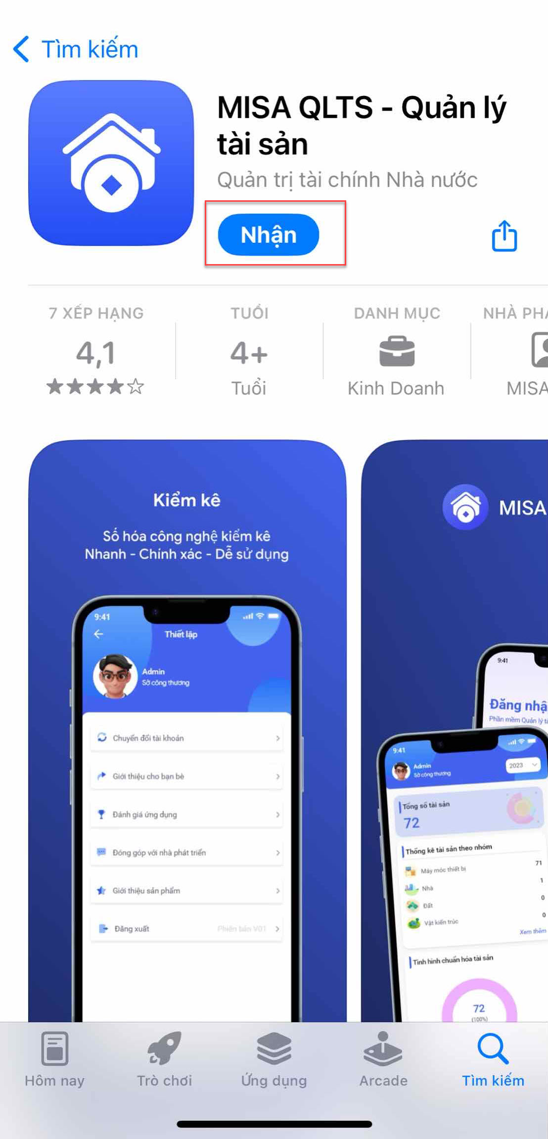 Bước 1: Vào chợ ứng dụng App Store trên điện thoại, nhập MISA QLTS trên thanh tìm kiếm. Tại ứng dụng MISA QLTS – Quản lý tài sản, nhấn Nhận để tải ứng dụng về điện thoại