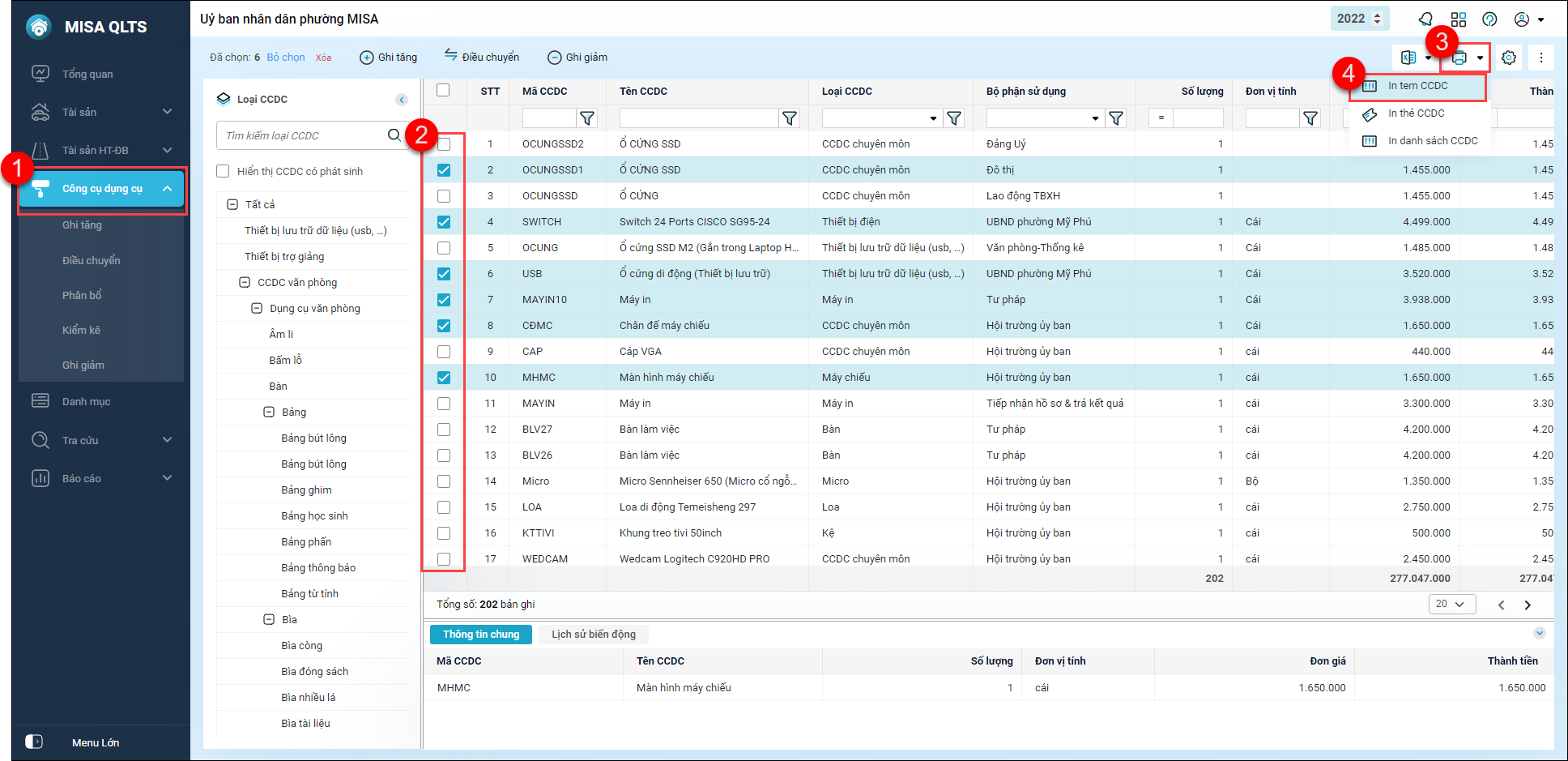 1. Vào menu Công cụ dụng cụ (1),tích chọn 1 hay nhiều bản ghi (2) và nhấn biểu tượng in (4). Tại đây phần mềm đã bổ sung tính năng In tem CCDC (4).
