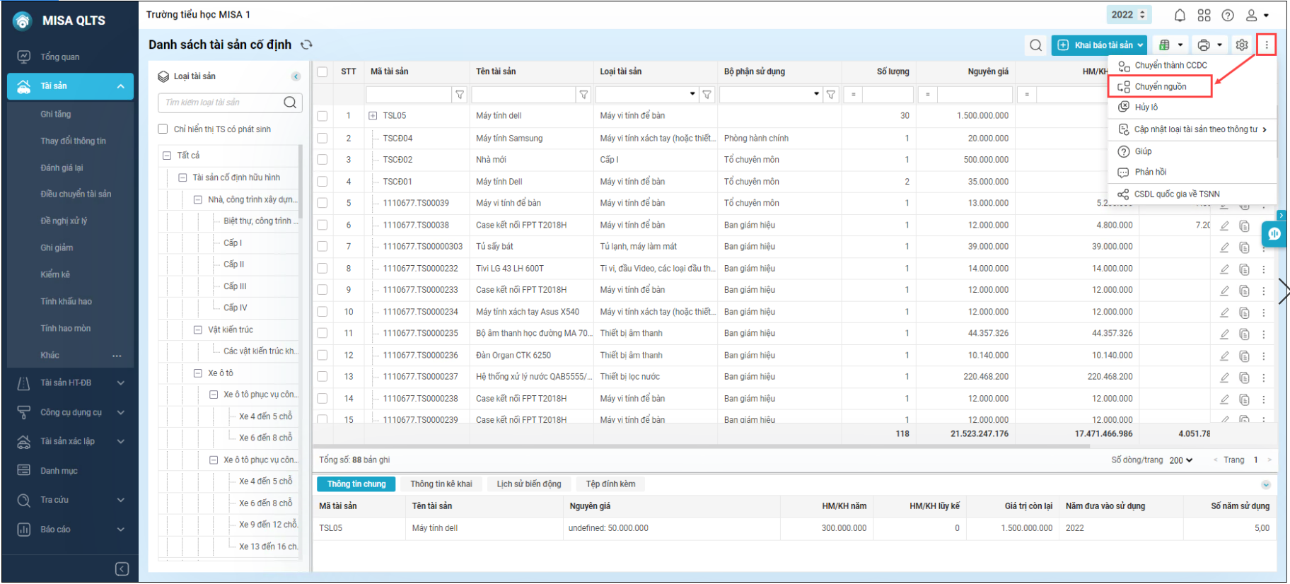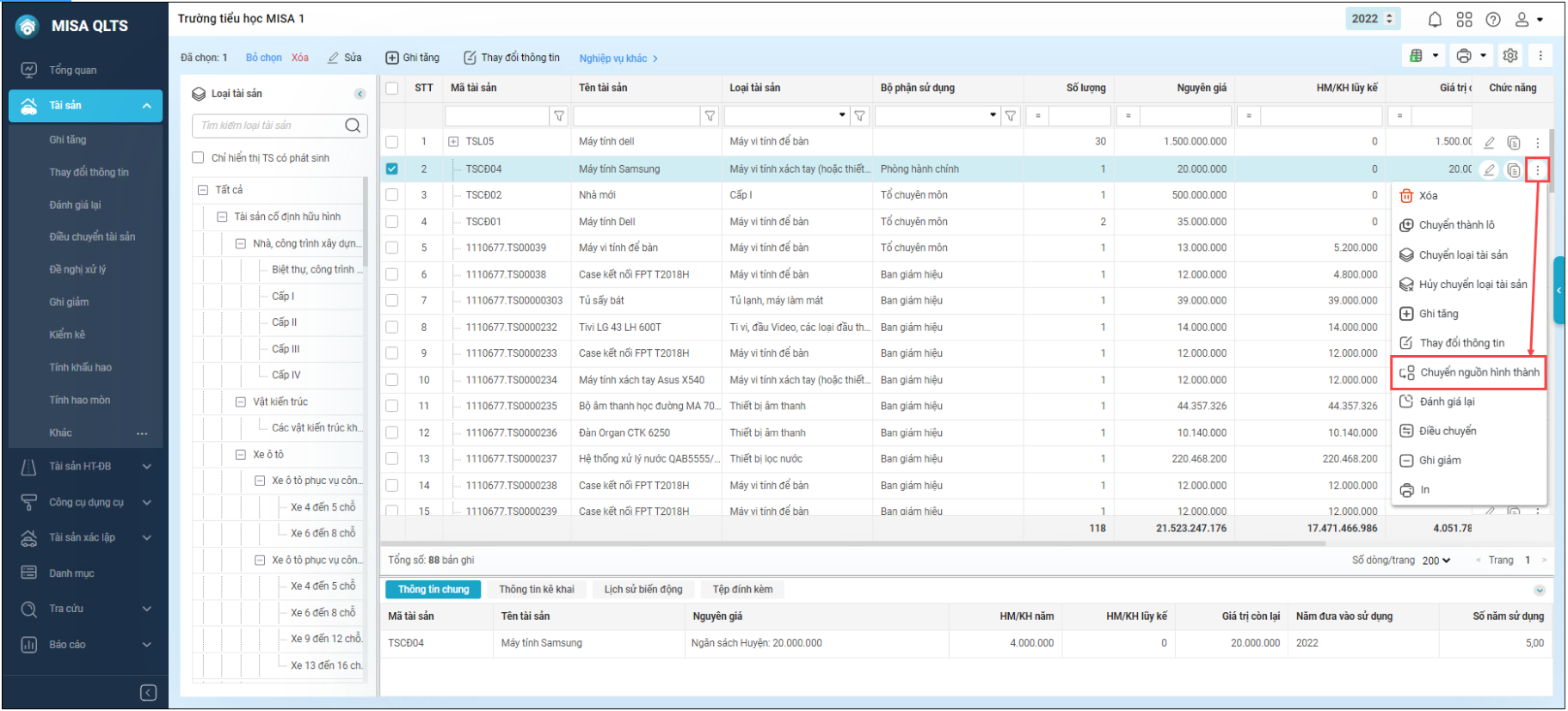 Chọn tài sản cần chuyển nguồn, nhấn vào biểu tượng dấu 3 chấm ở cột Chức năng, chọn Chuyển nguồn hình thành.