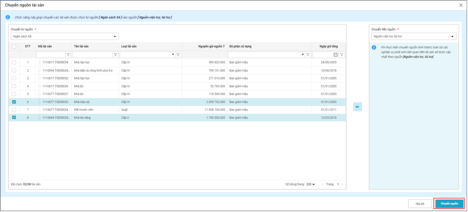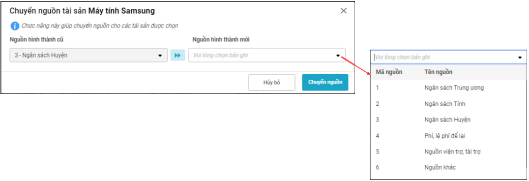 Chọn nguồn hình thành cần chuyển tại trường thông tin Chuyển từ nguồn => phần mềm tải lên các tài sản thuộc nguồn này. Tích chọn các tài sản cần chuyển nguồn.