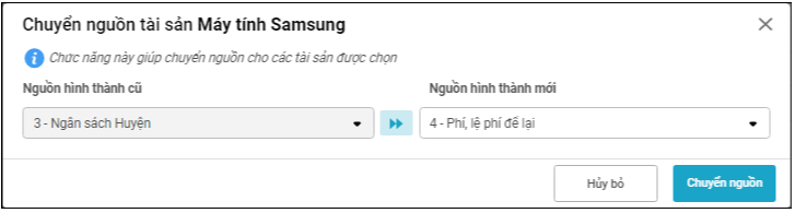 Chọn nguồn hình thành mới, nhấn Chuyển nguồn => Hệ thống cập nhật lại nguồn hình thành của tài sản. Toàn bộ các nghiệp vụ phát sinh liên quan đến tài sản sẽ được cập nhật theo nguồn mới.