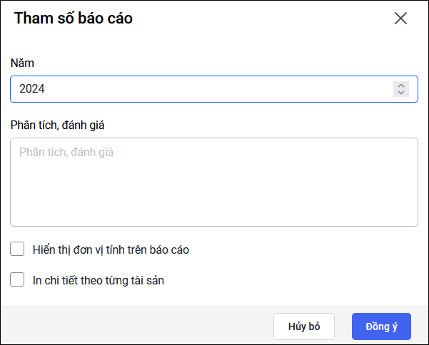Bước 2: Khai báo tham số báo cáo: Chọn Năm in báo cáo và nhấn Đồng ý.
