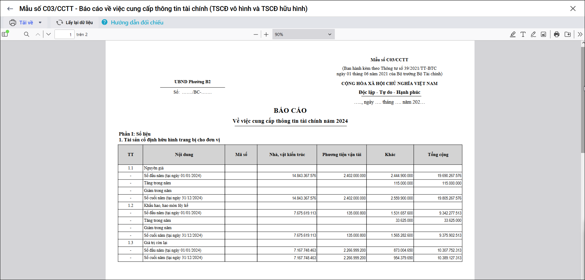 Khi nộp báo cáo tài chính, đơn vị cần in Mẫu số C03/CCTT – Báo cáo về việc cung cấp thông tin tài chính (TSCĐ hữu hình và TSCĐ vô hình) để gửi Kho bạc Nhà nước, nhằm đối chiếu số liệu với các báo cáo tài chính khác và đáp ứng quy định tại Thông tư số 39/2021/TT-BTC.