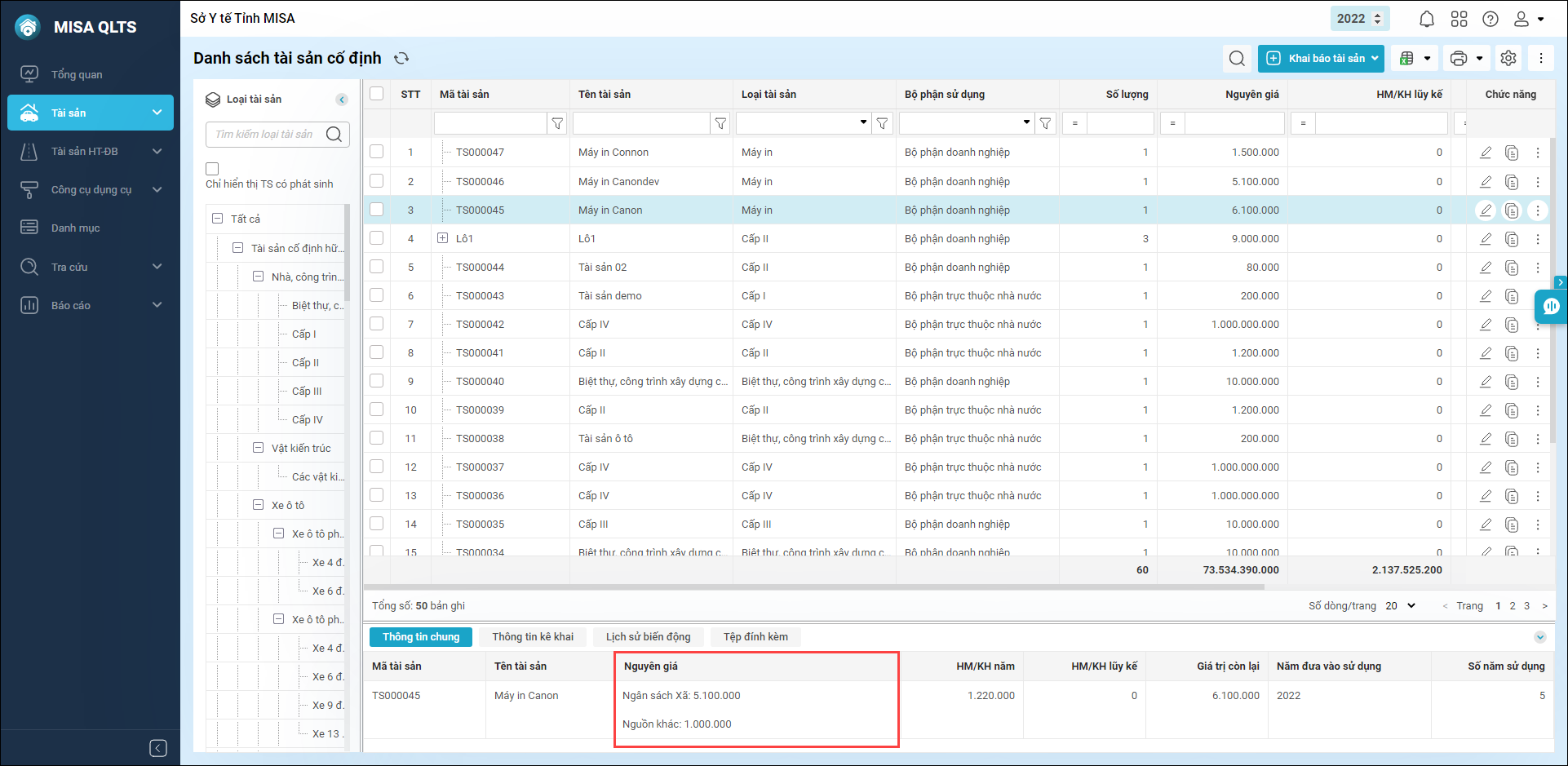 – Kể từ phiên bản R11, tại màn hình danh sách tài sản, phần hiển thị chi tiết thông tin tài sản > cột nguyên giá: Bổ sung thêm thông tin nguồn (mỗi nguyên giá 1 dòng)