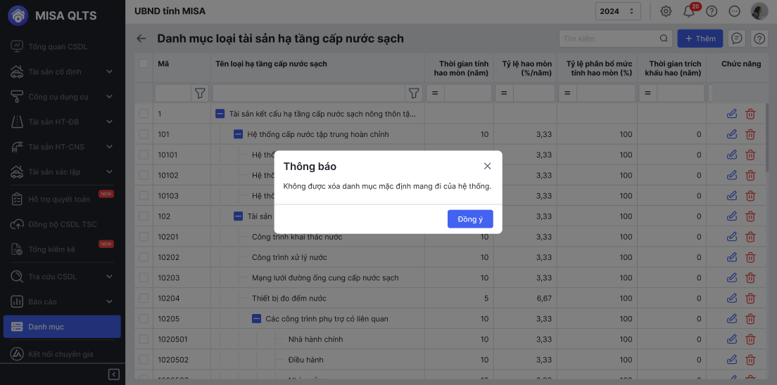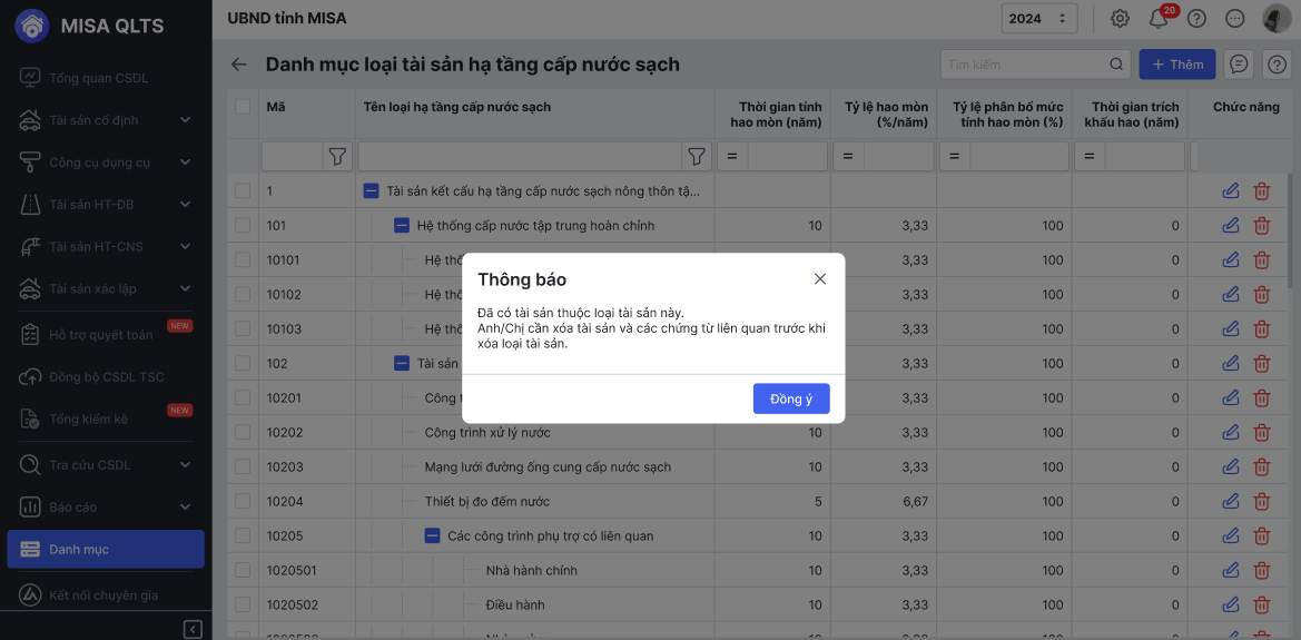 Bước 1: Chọn menu Danh mục\Loại tài sản hạ tầng cấp nước sạchBước 2: Anh/chị kiểm tra lại Danh mục loại tài sản cấp nước sạch