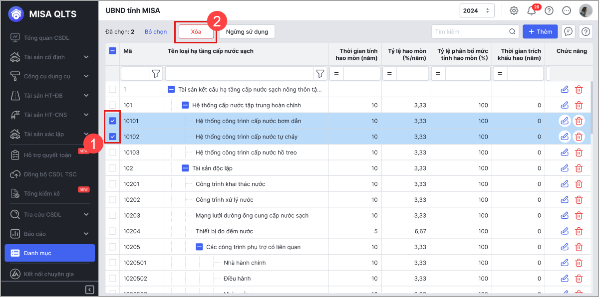 • Nếu muốn xóa nhiều loại tài sản cùng lúc anh/chị tích chọn loại tài sản cần xóa, chọn Xóa