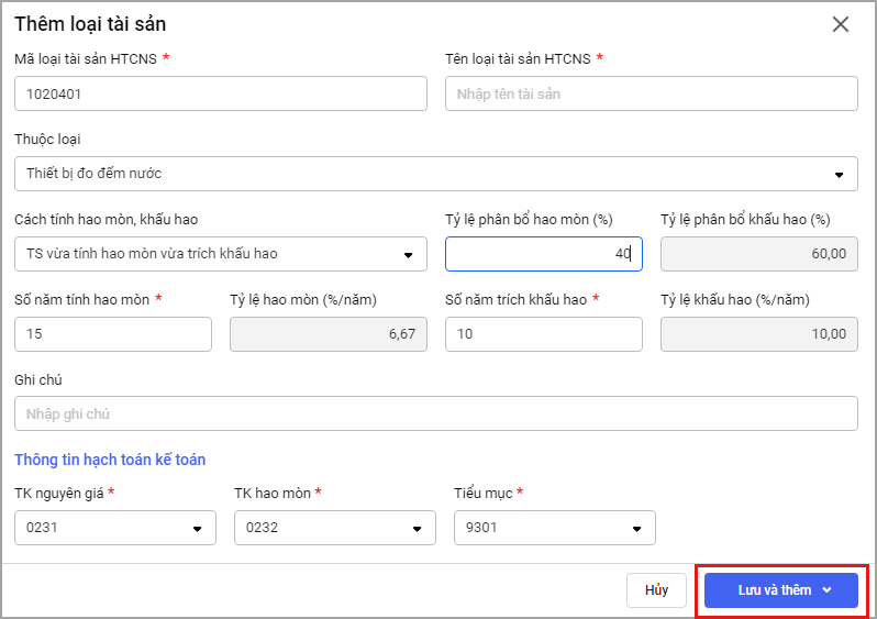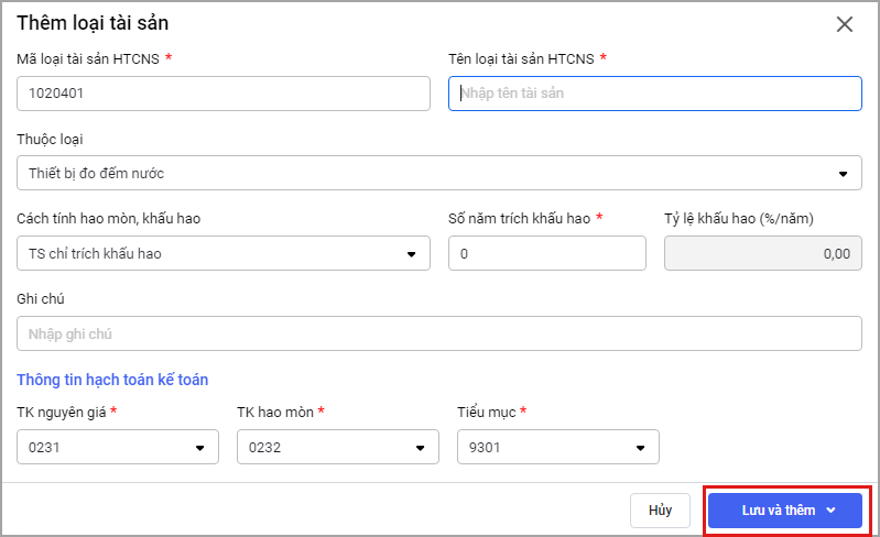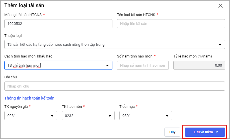 Bước 3: Nhập thông tin Loại tài sản tương ứng: