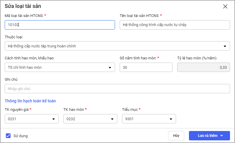 • Chỉnh sửa thông tin loại tài sản, chọn Lưu để lưu thay đổi.