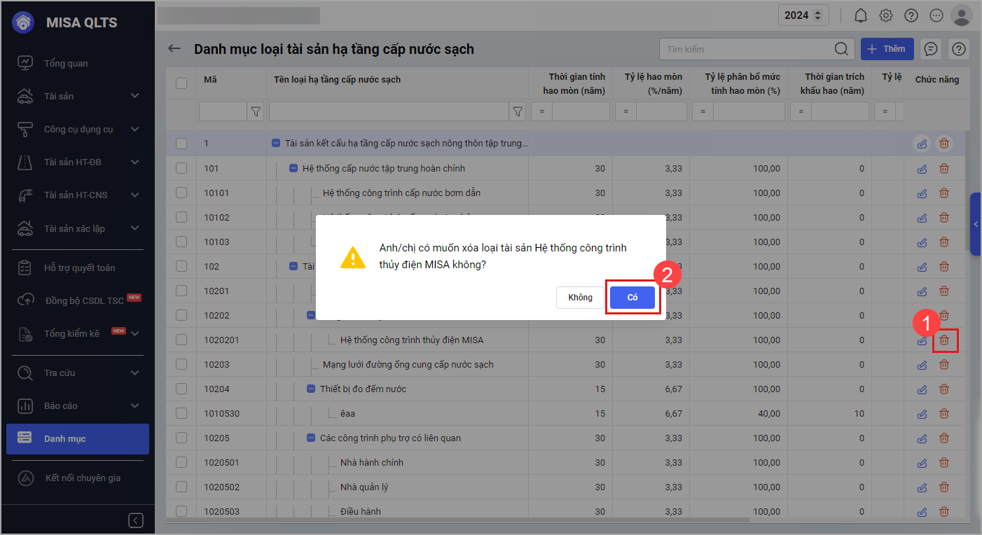 Bước 6: Để xóa loại tài sản anh/chị, anh/chị chọn biểu tượng thùng rác để xóa