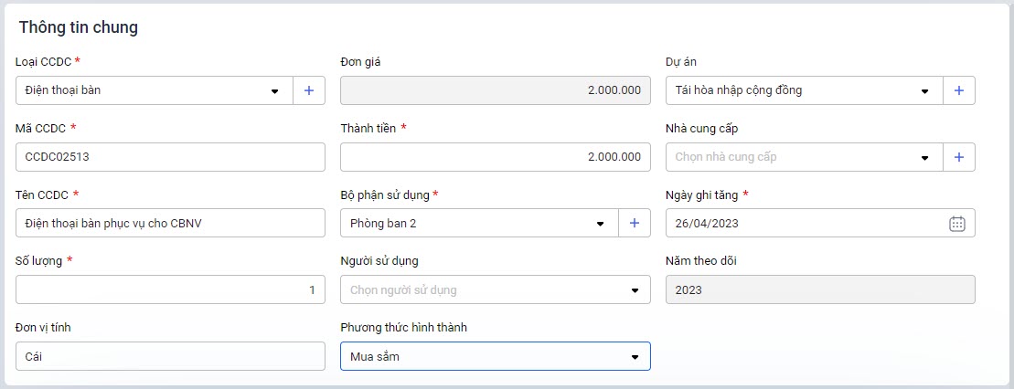 Ví dụ: Đơn vị có 1 loại ghế nhựa giống nhau với số lượng 1.000 cái. Khai báo 1 mã CCDC, nhập Số lượng = 1.000, Thành tiền là tổng giá trị mua.