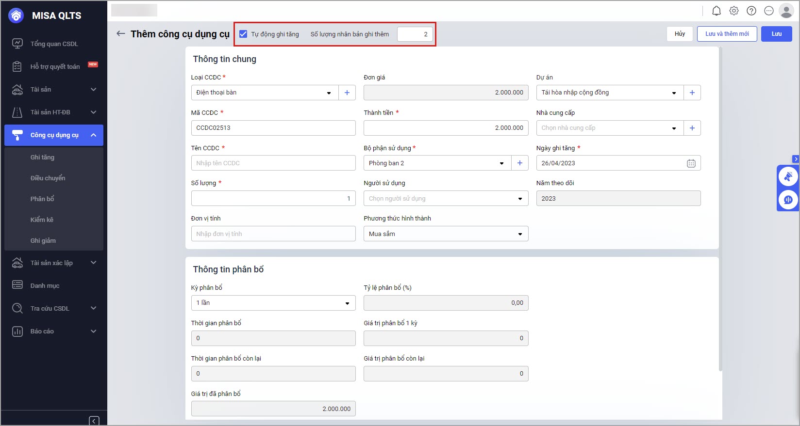 - Sau khi khai báo xong các thông tin CCDC, nếu muốn ghi tăng CCDC luôn thì tích chọn Tự động ghi tăng.