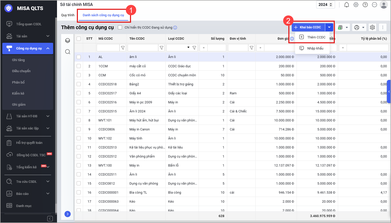 - Lưu ý: Nguyên tắc khai báo số lượng CCDC (bắt buộc nhập > 0).