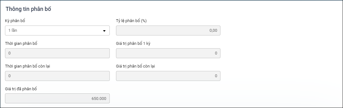 - Giá trị phân bổ còn lại: Tự động tính theo công thức Thành tiền – Giá trị đã phân bổ.