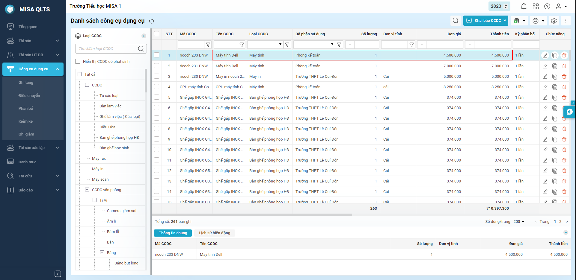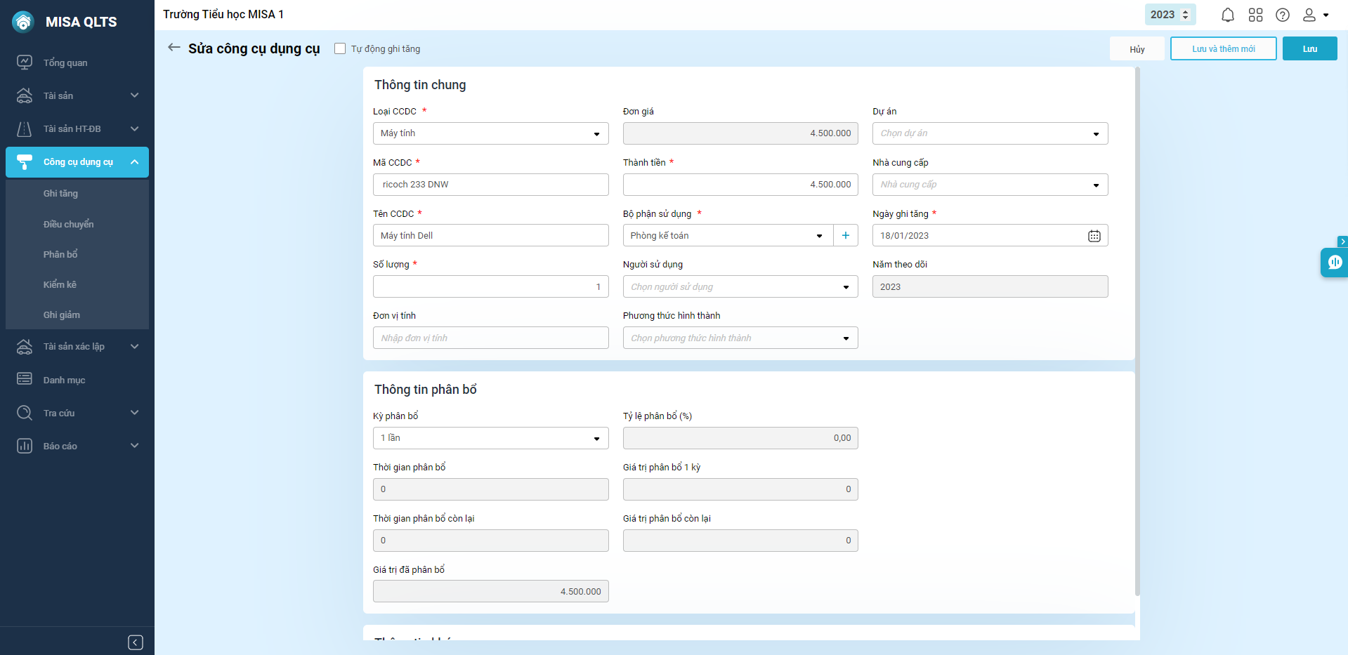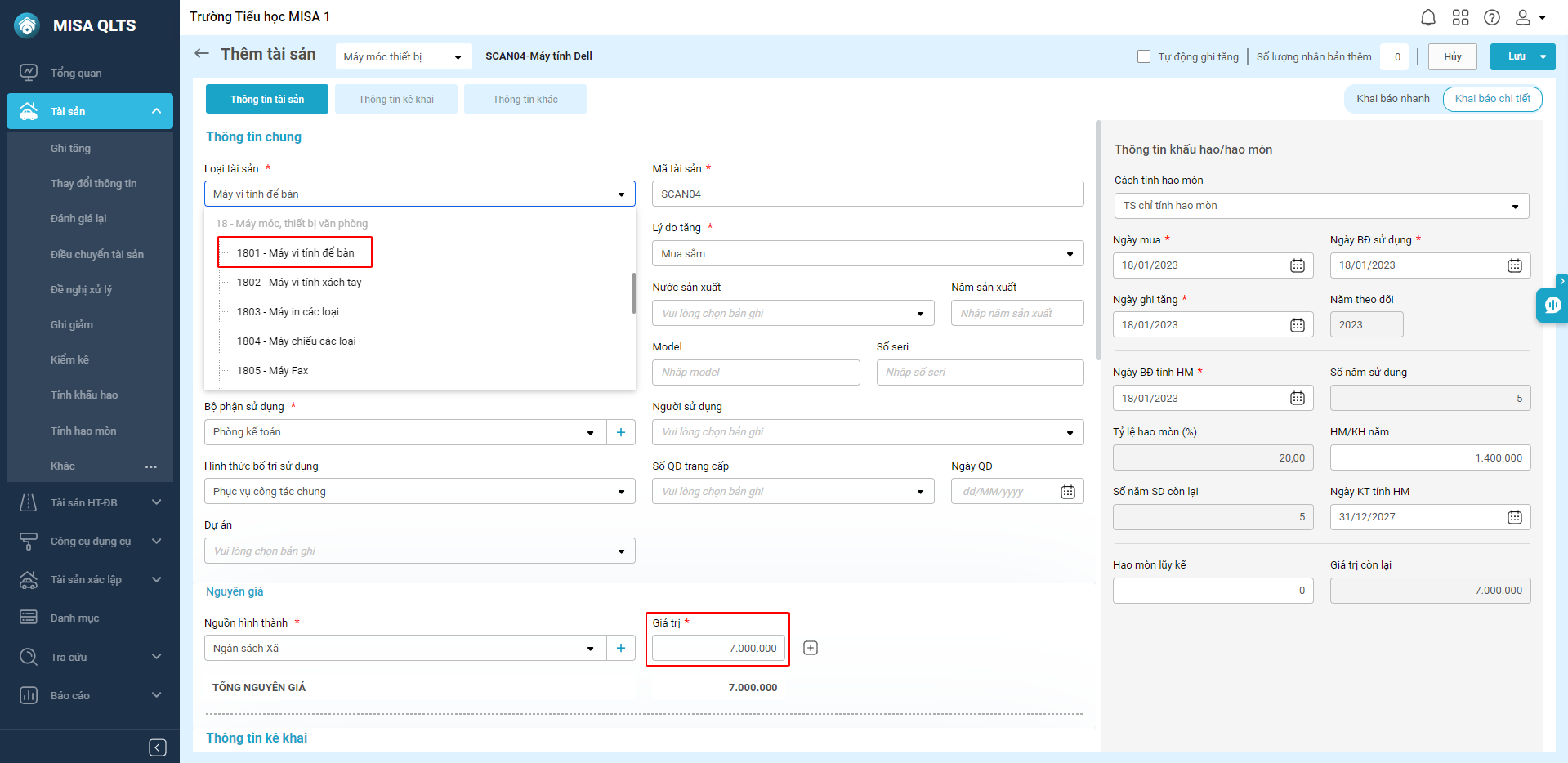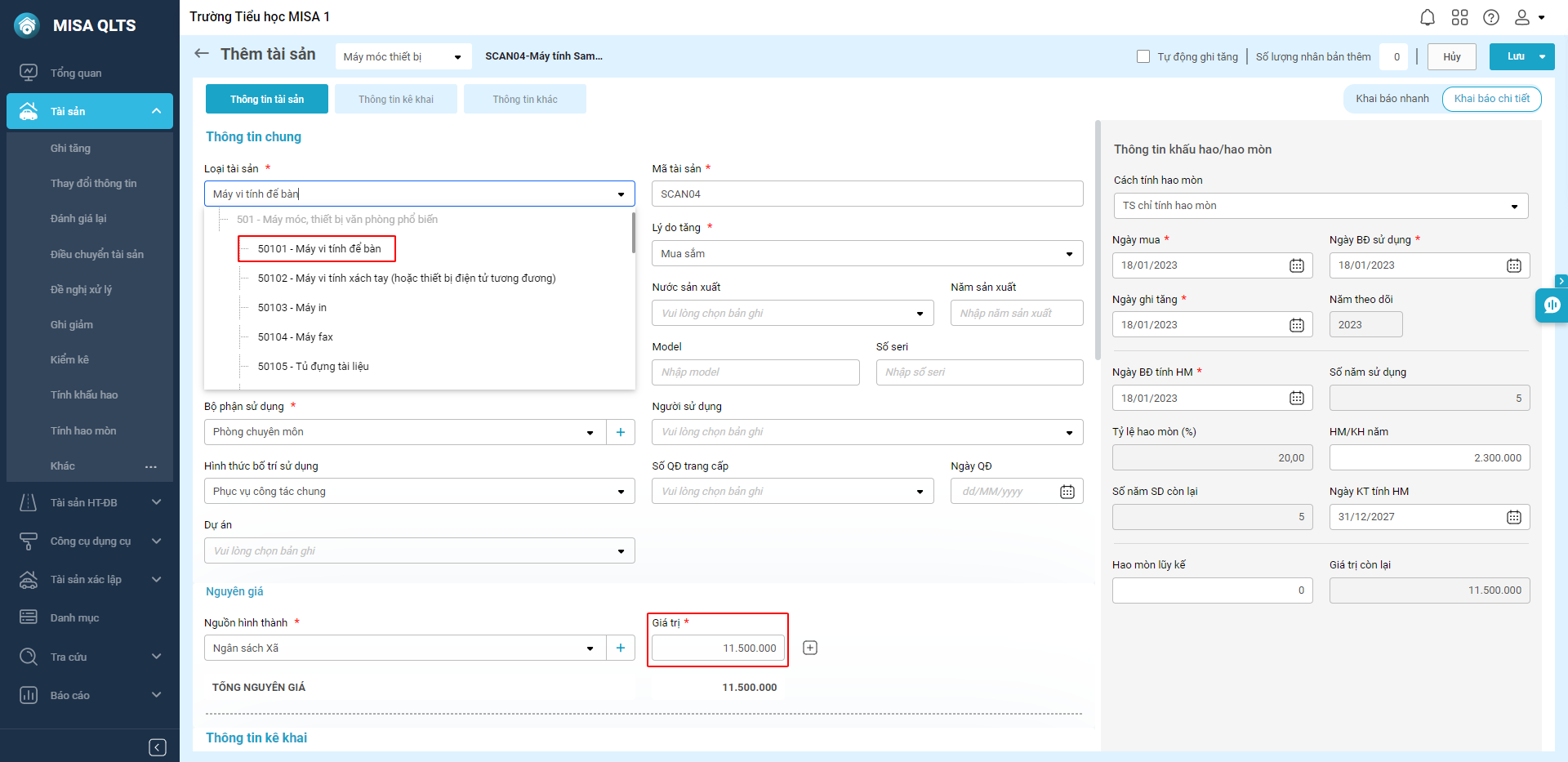 Ví dụ: Khi cần khai báo tài sản là máy tính có nguyên giá dưới 10.000.000 đồng và không thuộc danh mục TSCĐ theo quyết định đặc thù tỉnh, anh/chị ghi tăng tài sản này ở dạng CCDC.