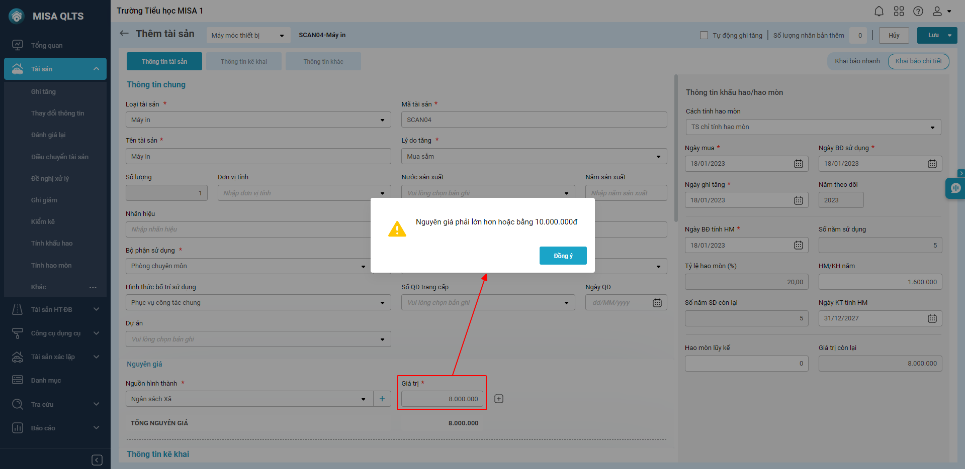 - Do đó, khi khai báo TSCĐ, anh/chị phải nhập nguyên giá từ 10.000.000 đồng trở lên, nếu nguyên giá thấp hơn 10.000.000 đồng, phần mềm sẽ hiển thị cảnh báo, anh/chị cần chọn lại loại tài sản cho phù hợp.