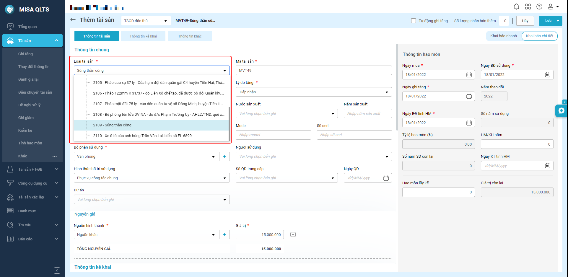 - Phần mềm MISA QLTS đã cải tiến tính năng khai báo tài sản để đáp ứng quy định về danh mục và nguyên giá tài sản tại Thông tư 45/2018/TT-BTC (TT45) và các quyết định đặc thù của Bộ/Tỉnh về quản lý TSCĐ.