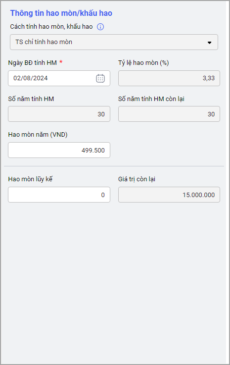 Các thông tin Cách tính hao mòn/khấu hao, Tỷ lệ HM, Số năm tính HM, Số năm tính HM còn lại, Giá trị còn lại đang được lấy lên từ danh mục của loại tài sản và các trường thông tin này không sửa được.