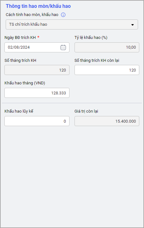 Các thông tin Cách tính hao mòn/khấu hao, Tỷ lệ khấu hao, Số tháng trích HM, Giá trị còn lại đang được lấy lên từ danh mục của loại tài sản và các trường thông tin này không sửa được.