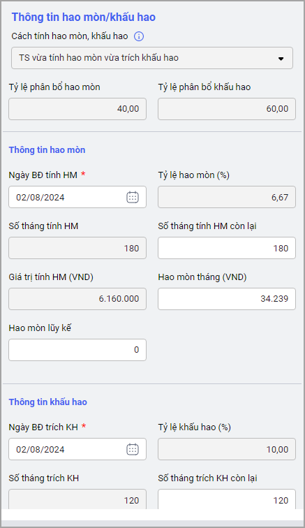 Các thông tin Cách tính hao mòn/khấu hao, Tỷ lệ phân bổ hao mòn, Tỷ lệ phân bổ khấu hao được lấy lên từ danh mục của loại tài sản và các trường thông tin này không sửa được.